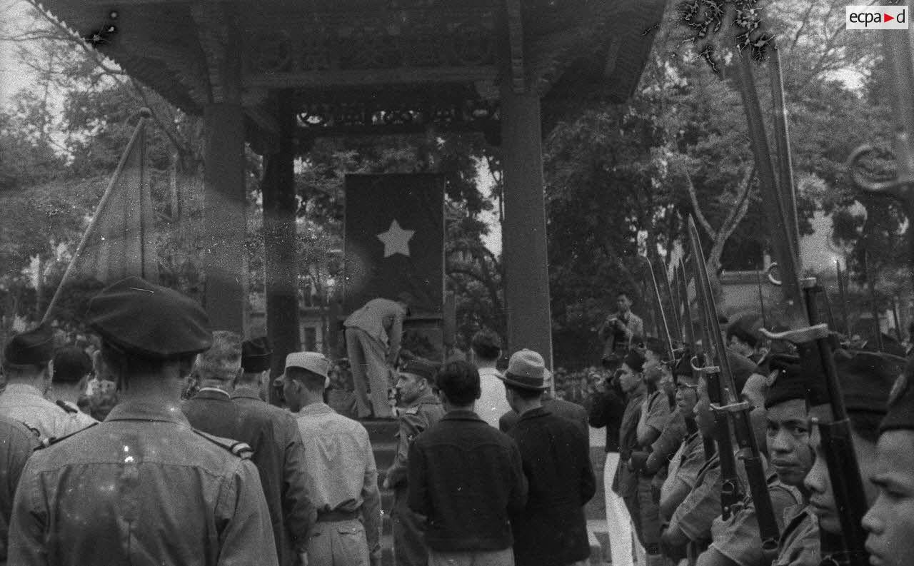 March 22, 1946 in Hanoi, during the joint Franco-Vietnamese parade between the National Guard of Vietnam and the French Army. General Leclerc laid flowers at a war memorial dedicated to Vietnamese soldiers (rather Annamites), naturally at the time decked out fully with a giant flag of the new republic, a scene that perhaps Leclerc was too careless to be intentionally captured in this way, considering the political negotiations had not entirely ruled out a military assault to dissolve this government.