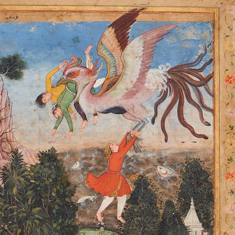 [Museum](https://collections.agakhanmuseum.org/collection/artifact/young-man-carried-simurgh-akm140). A young man grips the feet of an enormous technicolour simurgh flying above choppy waters filled with giant turtles, fish and a crocodile which looks like a makara, the mythical sea creature with magic powers. This painting may depict the story by Bahram Gur’s Indian princess wife in the Haft Paykar of the Persian poet, Nizami. King Bahram Gur had seven wives who told him tales from their separate, coloured pavilions each day of the week. In the Indian princess’s story, the hero is dramatically rescued by holding onto the feet of a simurgh who brings him to a paradise-like land.