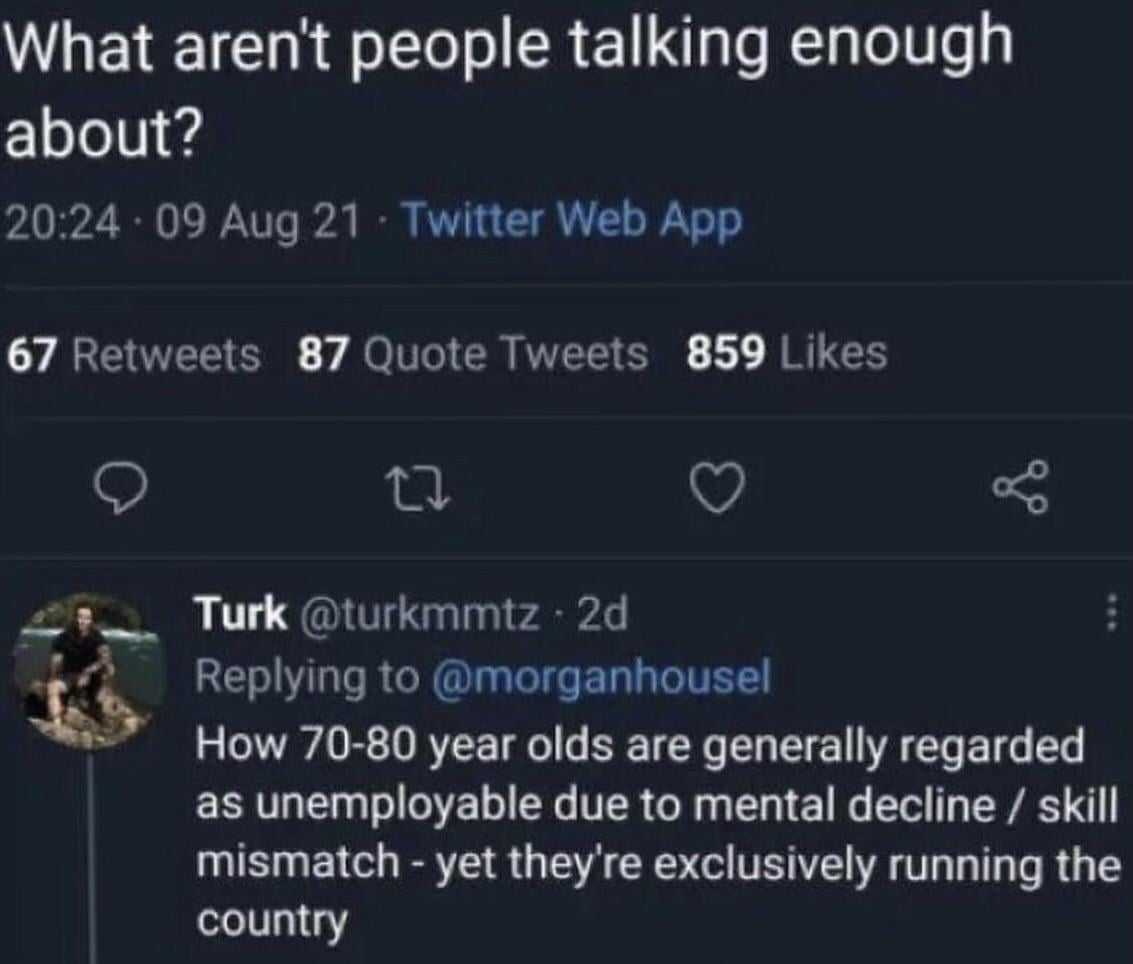 it is funny that people bring in age factor for president when discussing trump but wholeheartedly support biden or bernie sanders. dont bash me , I am not even white let alone american