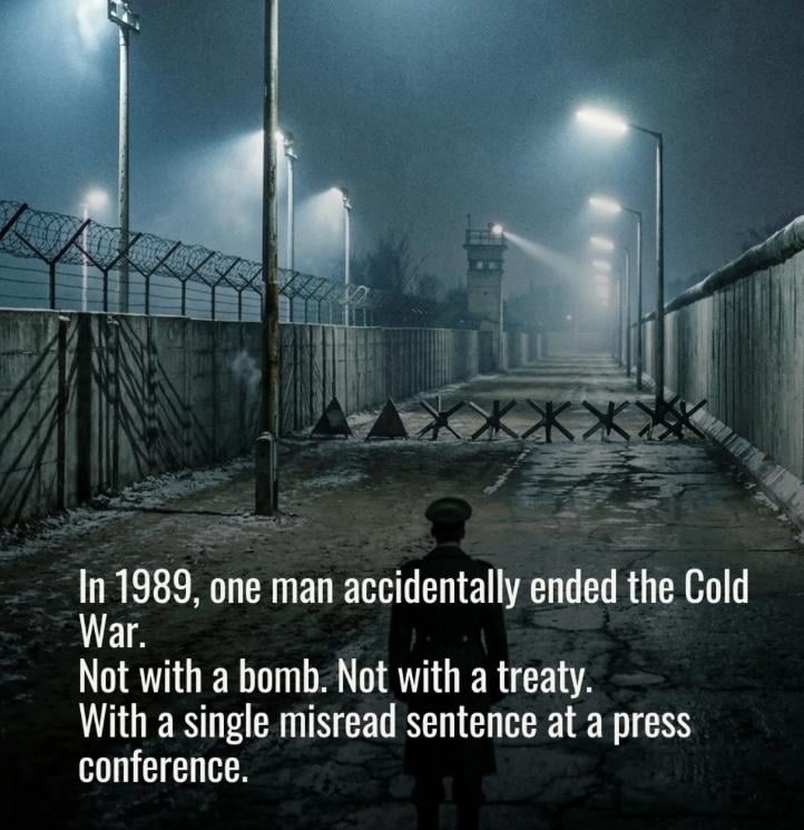 I cannot stand when history gets dumbed down to “one single man started/ended this major historical event.” That’s not how anything has ever worked. The GDR was already on its last legs for a plethora of reasons by 1989. This guy’s mistake may have sped its collapse up a bit but the foundation had already rotted to its core well before his announcement.