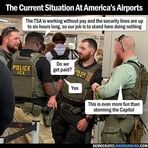 This was just an excuse to place ICE in the airports, an extension of Trump’s private militia. They are there for good now.