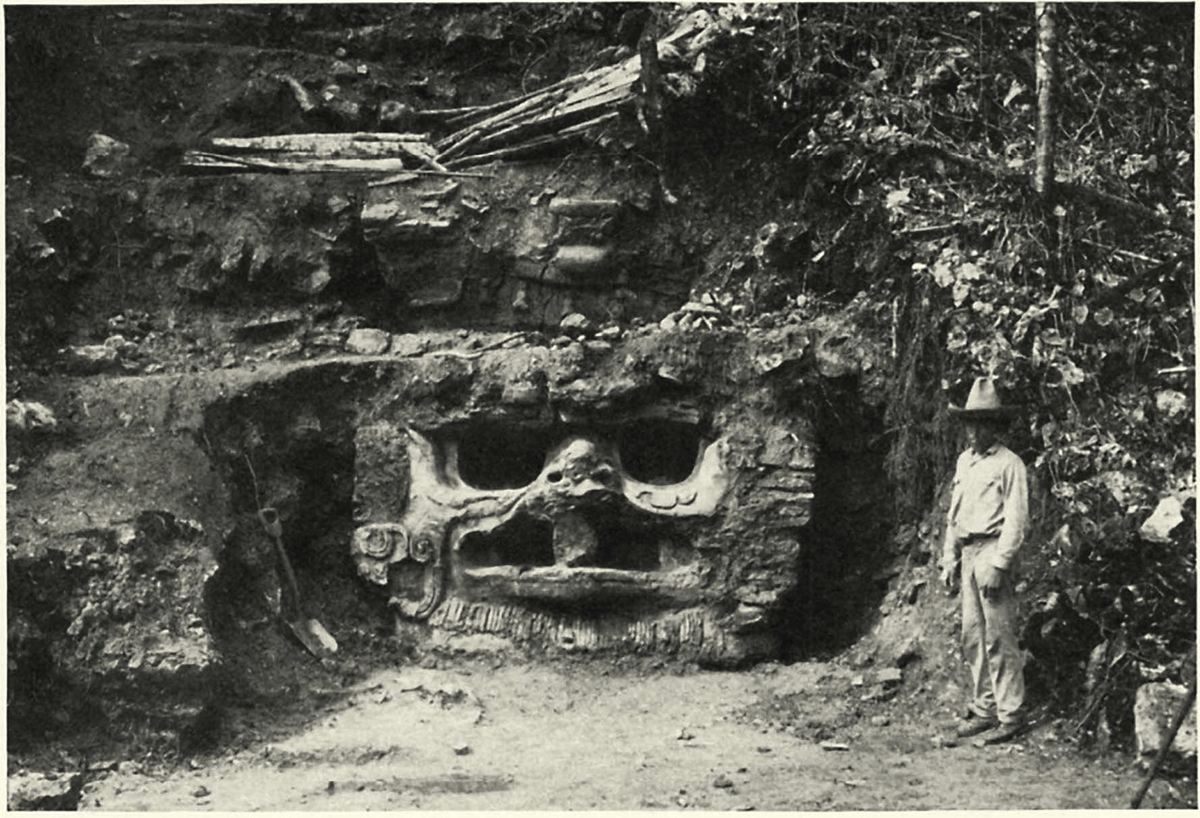 An old photo from 1935 showing a large stucco mask from the pyramid structure K-5 at the ancient Maya city of Piedras Negras in Guatemala. 600-850 CE [1200×818]