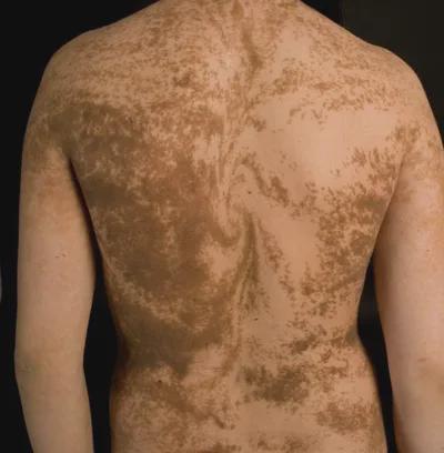 *Blaschko’s lines, also called the lines of Blaschko, are lines of normal cell development in the skin. These lines are only visible in those with a mosaic[1][2][3] skin condition or in chimeras where different cell lines contain different genes.[4] These lines may express different amounts of melanin,[5] or become visible due to a differing susceptibility to disease. In such individuals, they can become apparent as whorls, patches, streaks or lines in a linear or segmental distribution over the skin. They follow a V shape over the back, S-shaped whirls over the chest and sides, and wavy shapes on the head.[6][7] Not all mosaic skin conditions follow Blaschko’s lines.[8]*