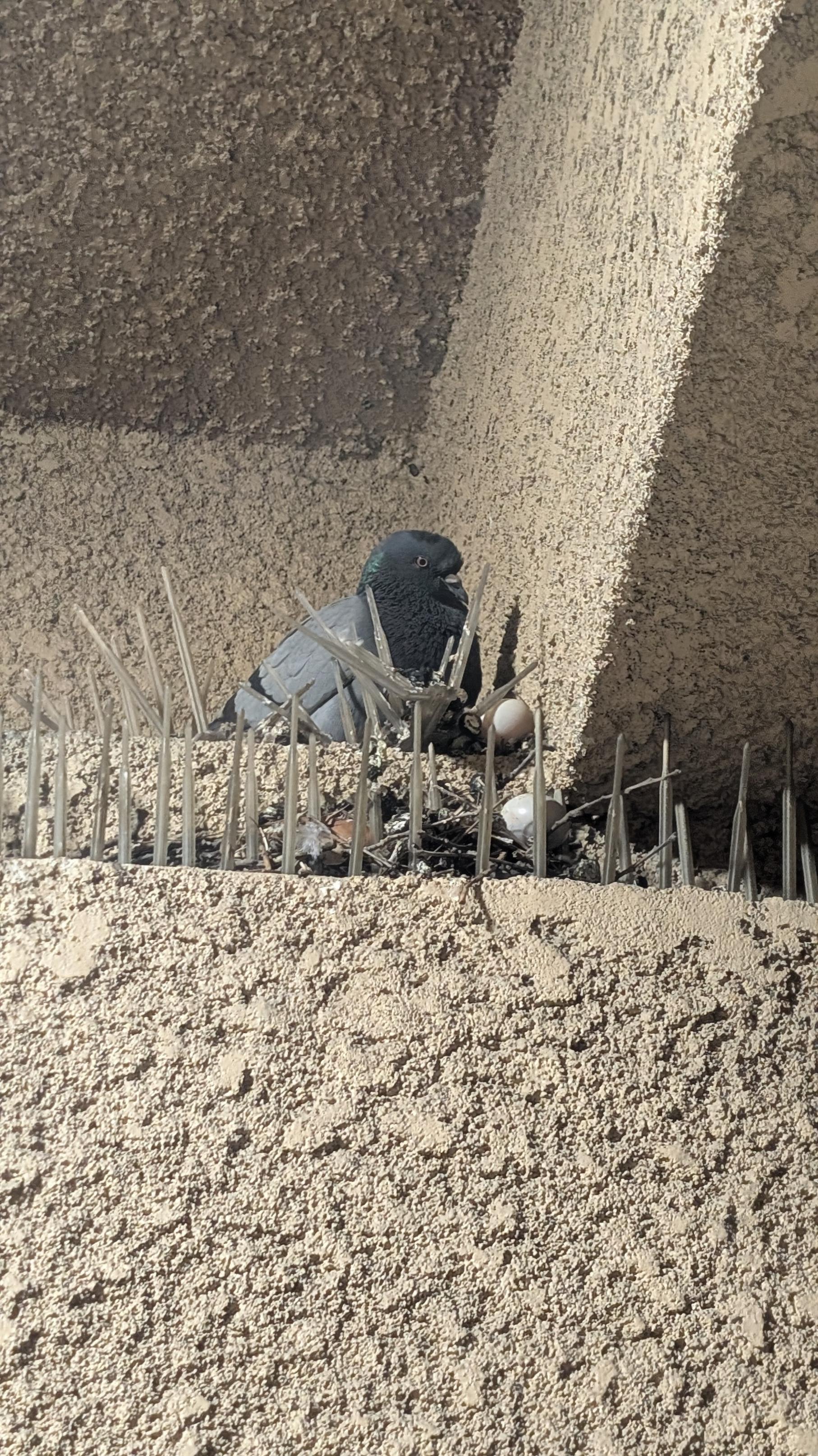 This pigeon has laid her eggs on the very barriers meant to keep her from perching