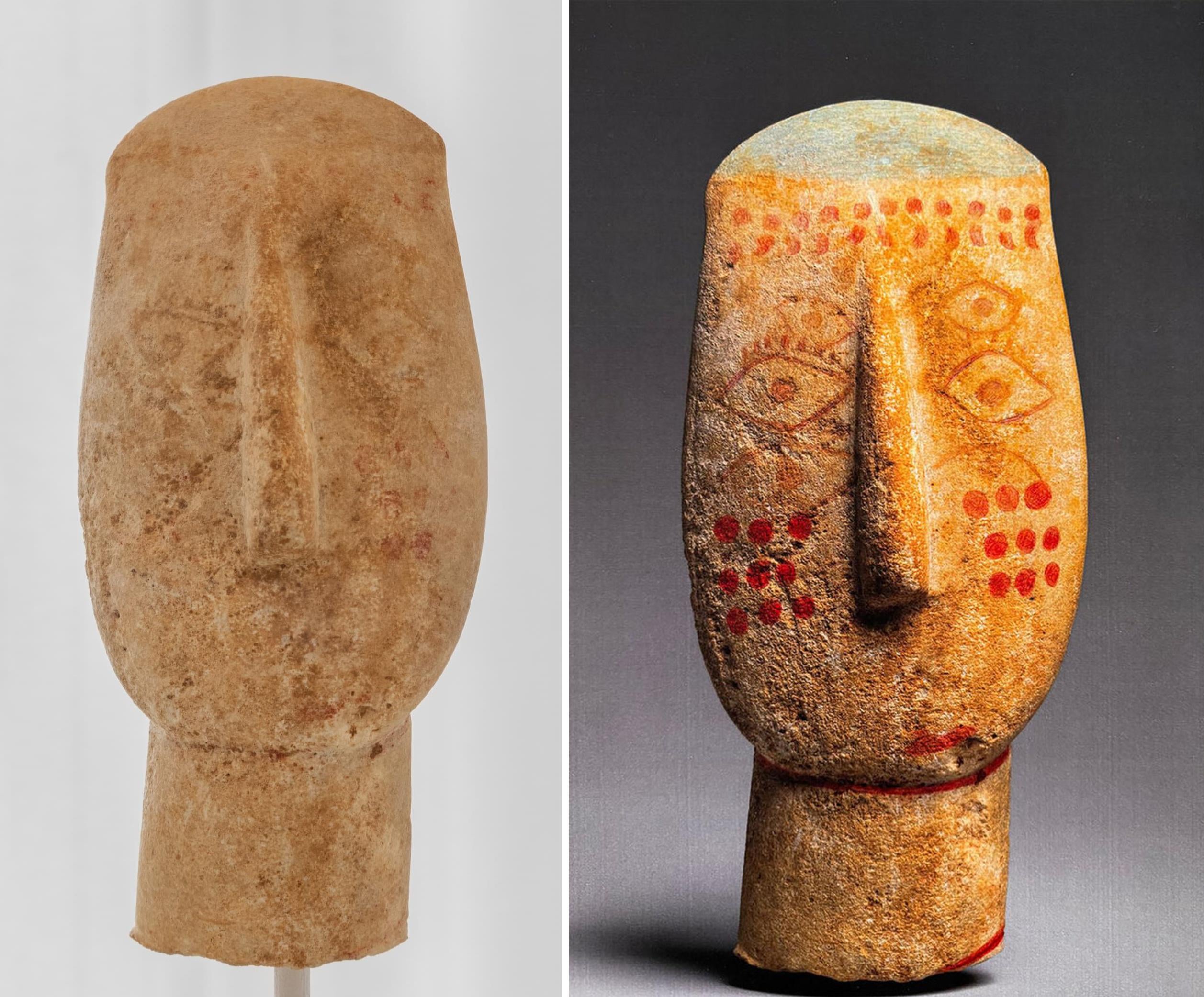 On the left: marble head of a Cycladic female figure with preserved red pigment remains, ca. 2500–2300 BCE, from Greece. On the right: Color reconstructions by Elizabeth Hendrix [2515×2084]