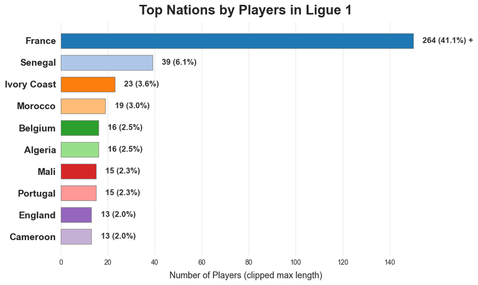 And the only league where France is not the country with the most non-native players is La Liga, where Argentina has 3 more players ? Pretty impressive.