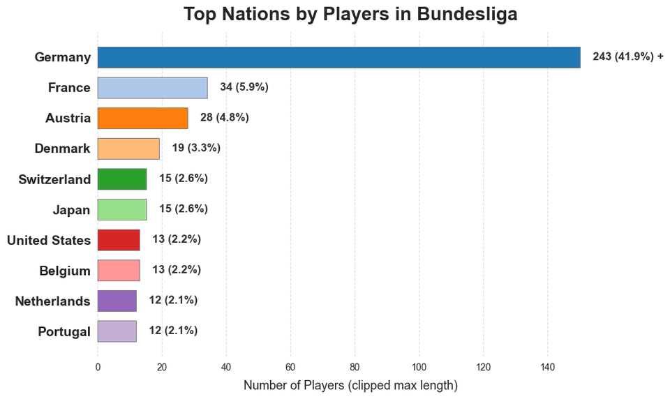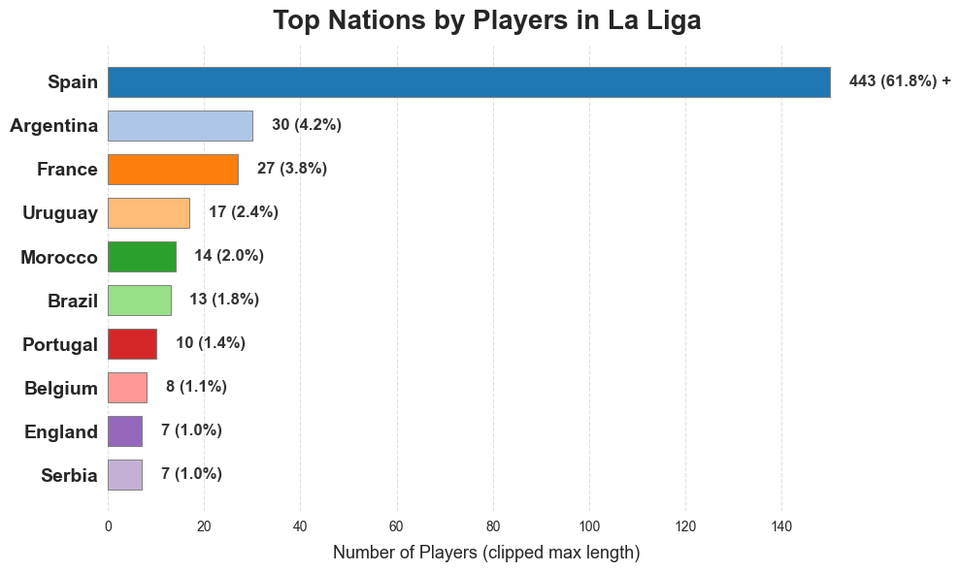 [OC] Top Nations by players in Big 5 European Soccer Leagues