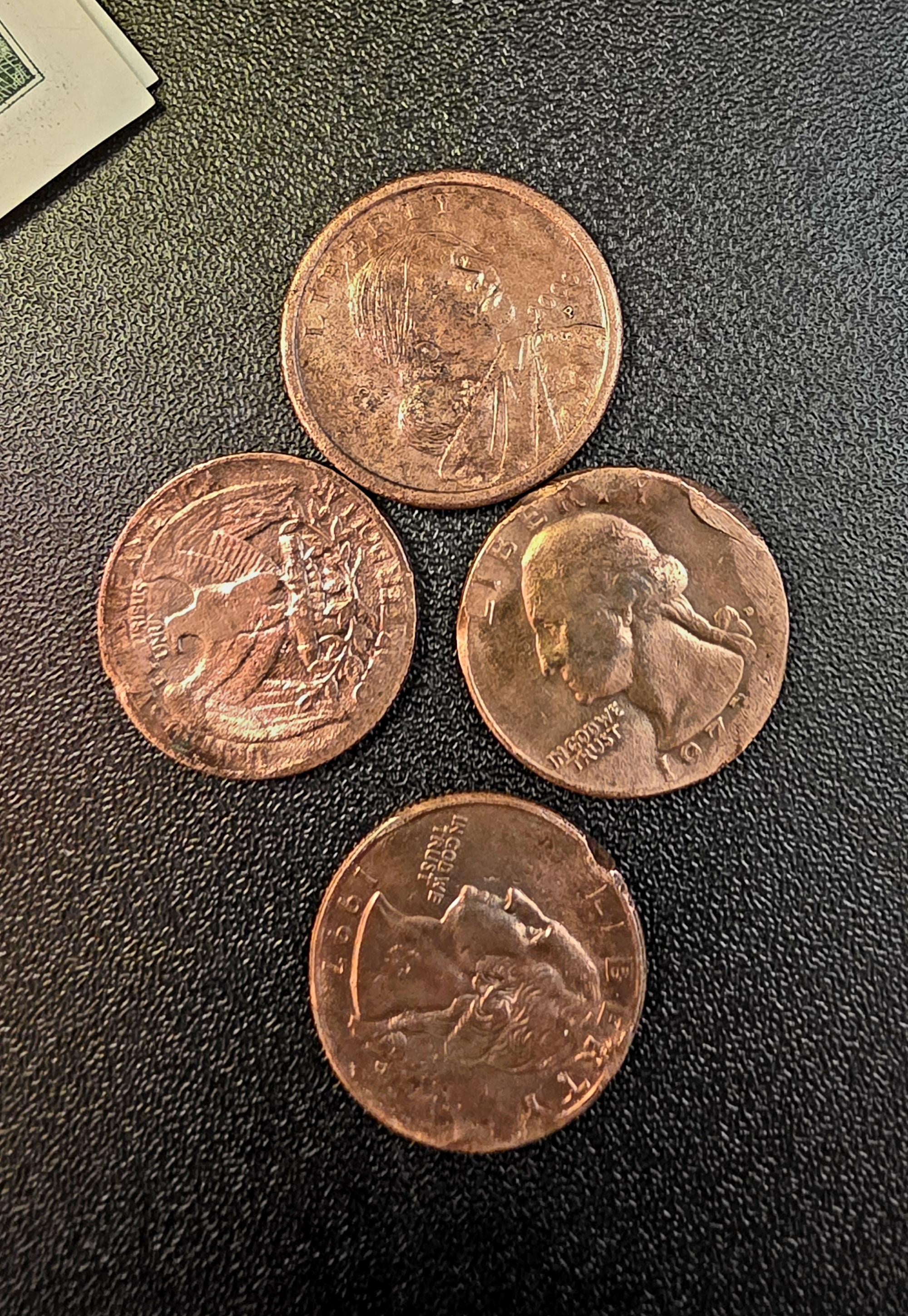 When I cleaned them up this is what came out. Apparently the CLR removes copper from the pennies and then through electron ionization deposits the copper onto the quarters and other coins.