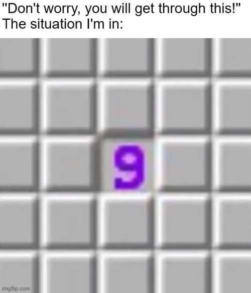 JustChickNugget on October 11, 2023 2:20 am Imagine getting 9 in the minesweeper. After all, there is always a way out even from a hopeless situation. What will you do?