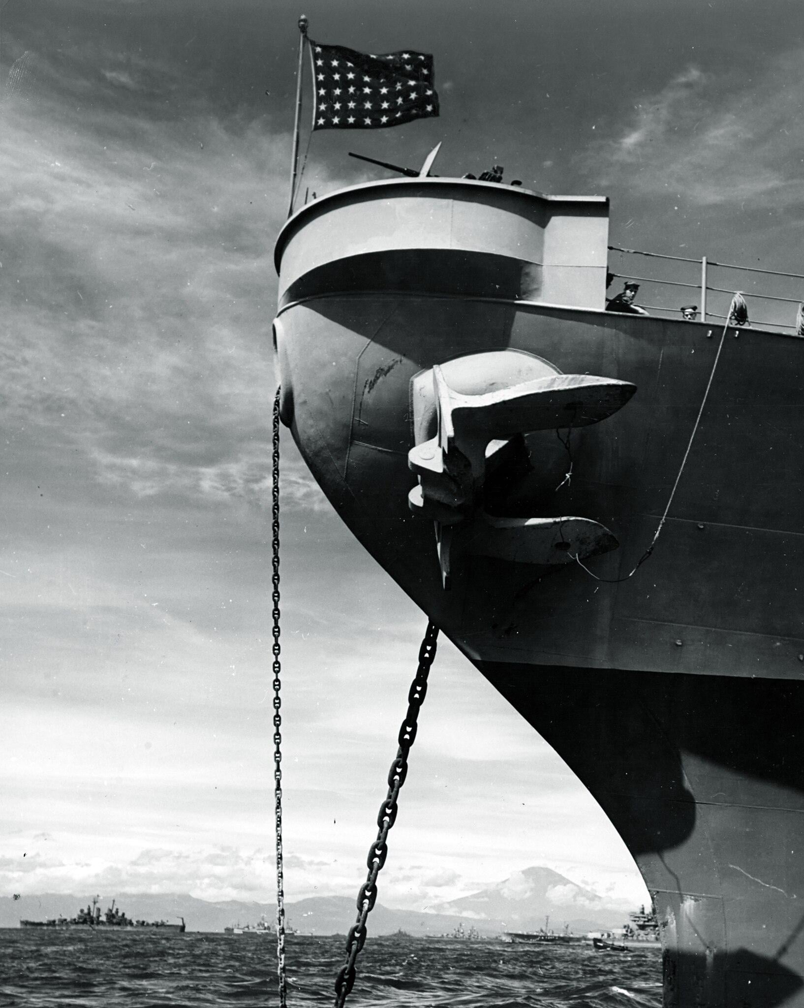 The USS Missouri anchored in Tokyo Bay after waiting for minesweepers to clear the entrance to the bay, awaiting the formal Japanese surrender ceremony that would soon be held on its deck. (1945) [1634×2048]