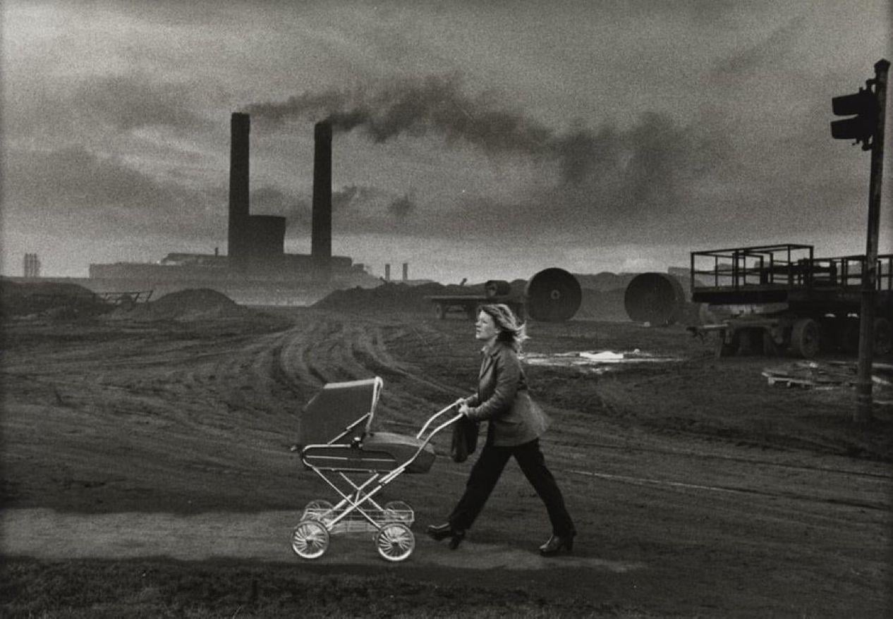 Woman with pram strolls past the local steel works. Consett, UK (1974).