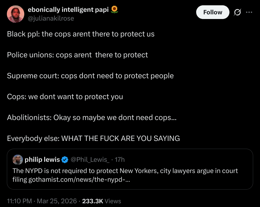 The Supreme Court has upheld for a long time that police aren’t obligated to protect the public.