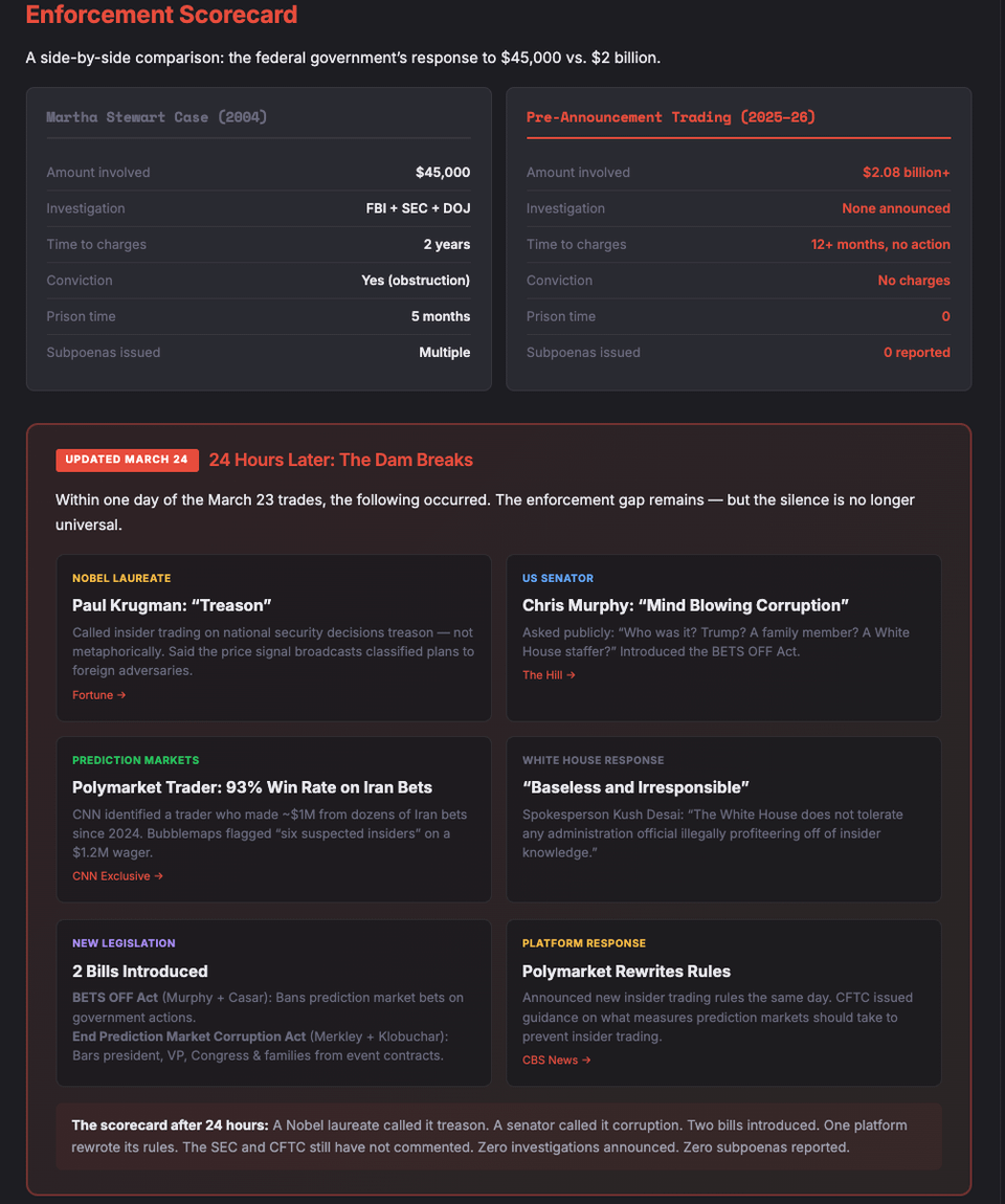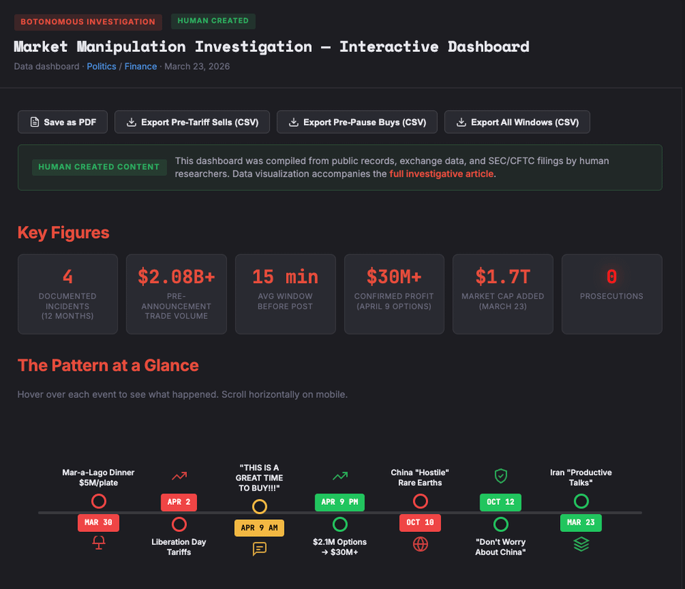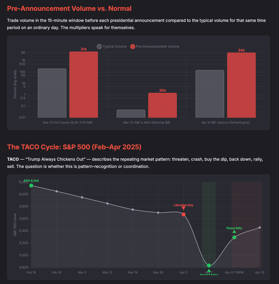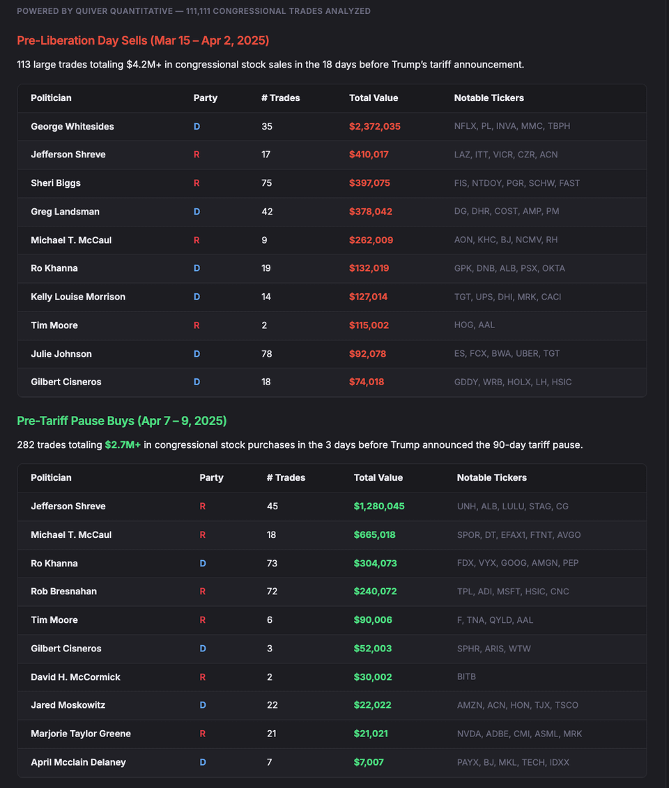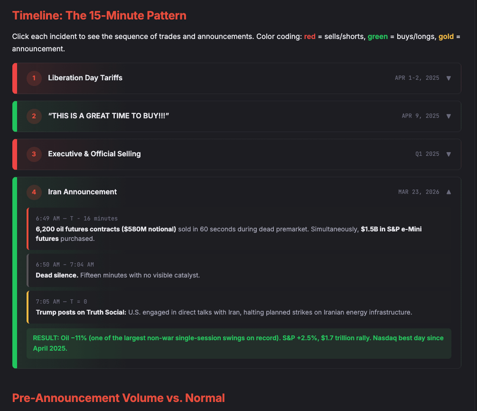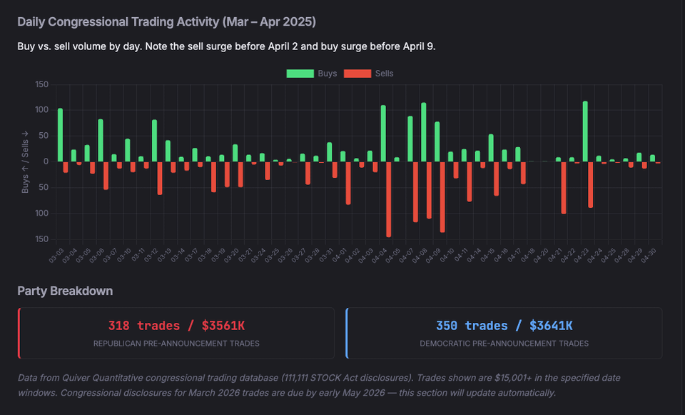 Methodology: Pulled all congressional stock trades from the Quiver Quantitative database and filtered for trades within 3-day windows around 7 presidential social media posts that moved markets between March 2025 and March 2026. Trade values are from STOCK Act disclosure ranges (minimum reported). Futures volume comparisons use the 5-day average for the same time window as baseline. All data is from public filings and exchange records.
