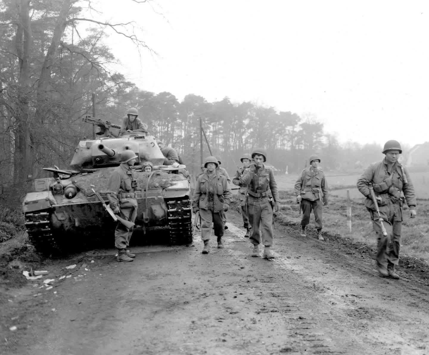GIs of the 30th Infantry Division advance near Wesel, Germany with an M24 Chaffee in pursuit of retreating German forces – March 26, 1945. US Army Signal Corps photo #SC-270975. [1440×1192]