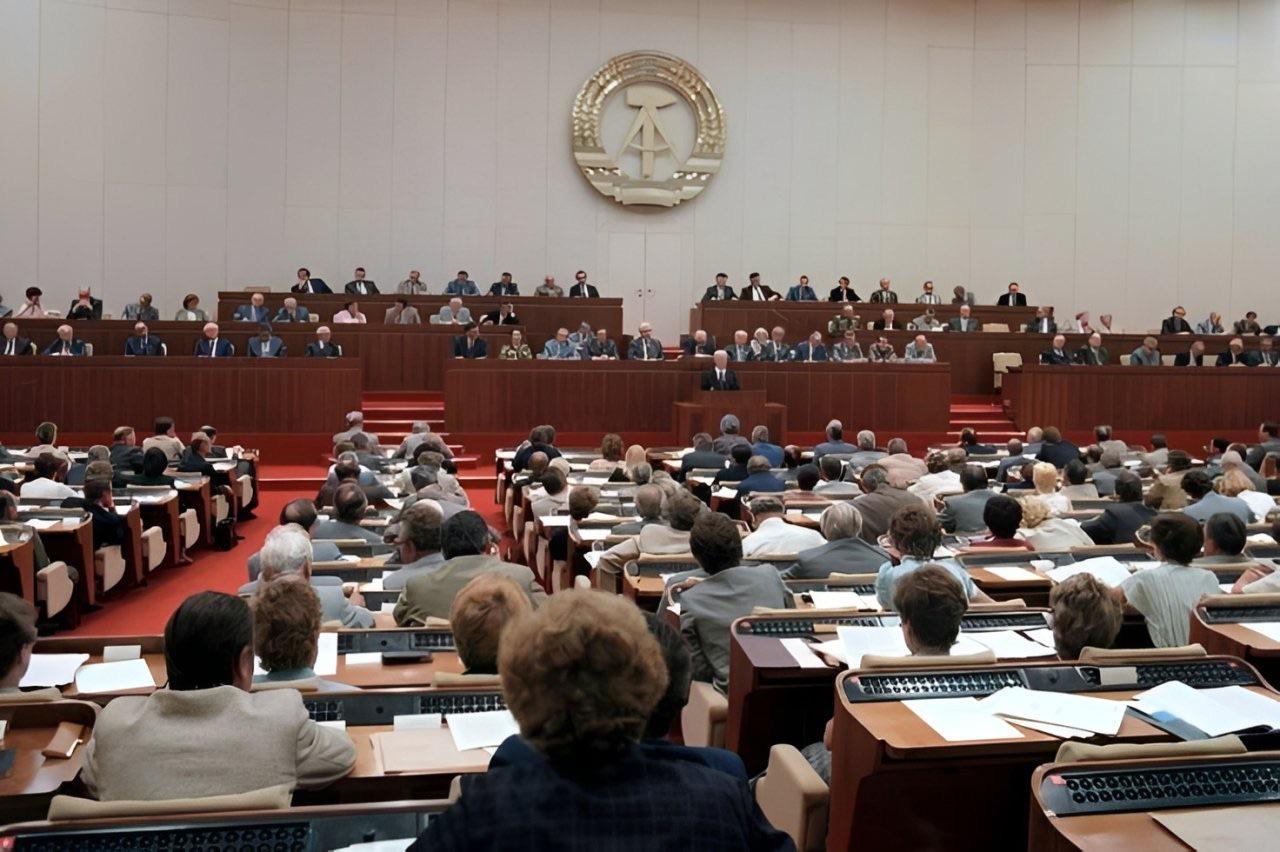 Willi Stoph, Chairman of the Council of Ministers of the GDR, speaking at the lectern in the plenary hall of the Palace of the Republic – behind him, on the bench, were officials of the Socialist Unity Party during a session of the Volkskammer, East Germany on June 30th, 1988. [1280 x 852]