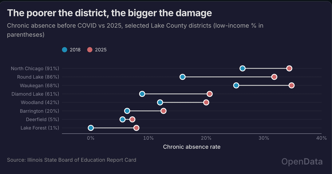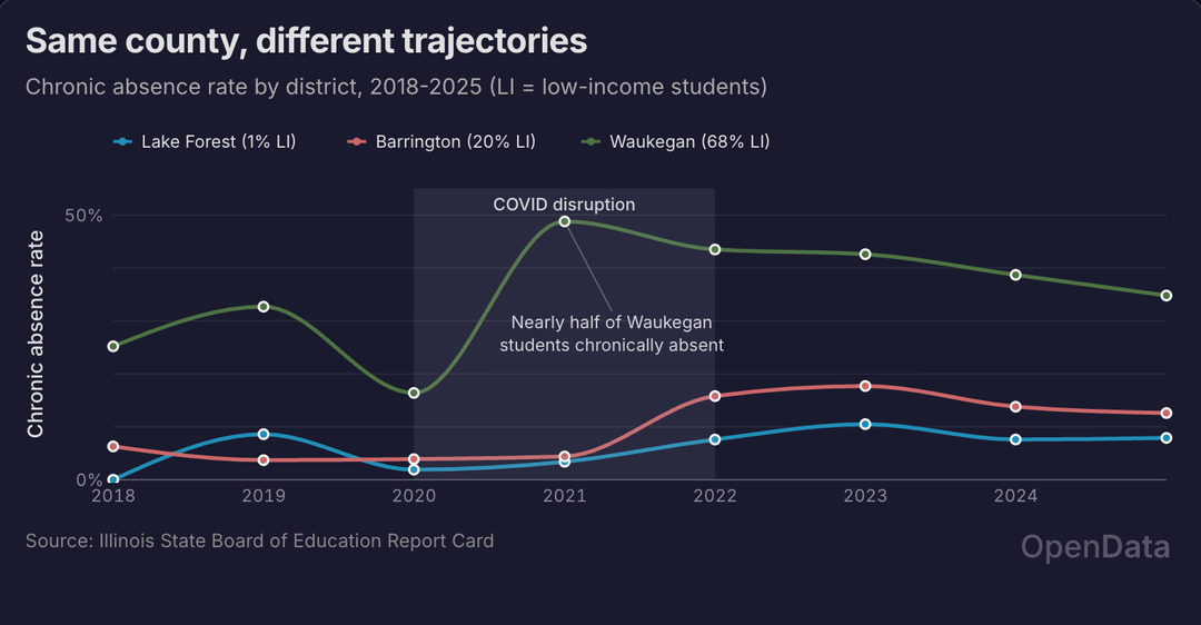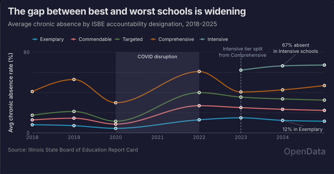 * Full writeup with all the charts and methodology: [https://labs.tryopendata.ai/illinois-schools-chronic-absence-crisis](https://labs.tryopendata.ai/illinois-schools-chronic-absence-crisis)