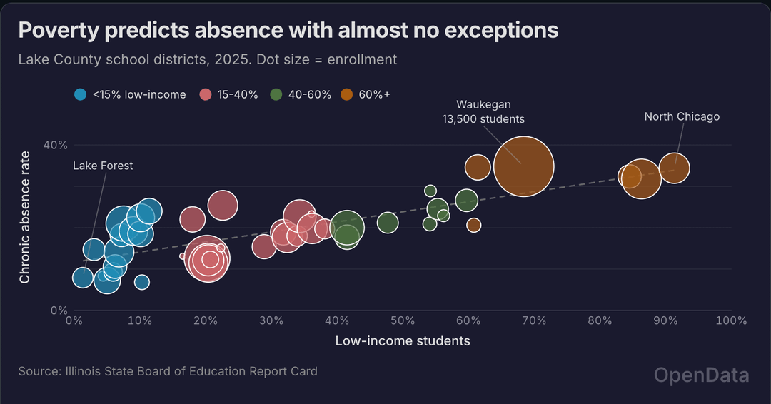 - North Chicago: 91% low-income, 34.4% chronic absence. These schools are six miles apart (in the same district). Chart 3 plots every district in the county by poverty rate vs. absence rate and it's basically a straight line.
