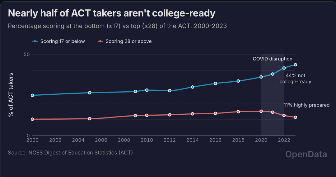 - Confusingly, graduation rates held steady at ~87-89% the whole time chronic absence was spiking 50%. Meanwhile, 44% of ACT takers now score below college-readiness (up from 25% in 2000). The hypothesis is: the diplomas kept printing, the actual learning didn't keep up.