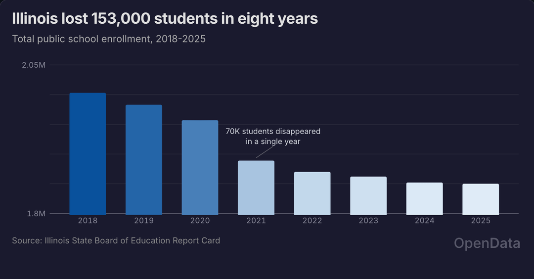 - Illinois lost 153,000 public school students over this period. The hypothesis is that wealthier families left for private schools or homeschooling during COVID and never came back. Statewide poverty actually fell, but school-level poverty concentrated. The kids who remained are poorer on average.