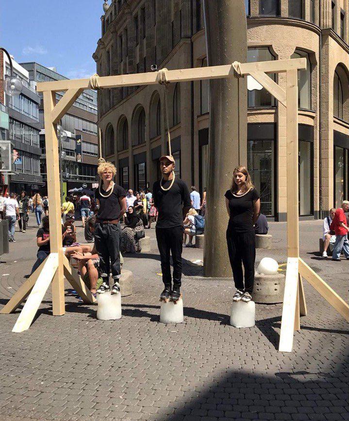This is an artistic installation to attract attention, make people think and get a point across. They are not literally hanging themself or putting them self in real danger (apart from slipping maybe).