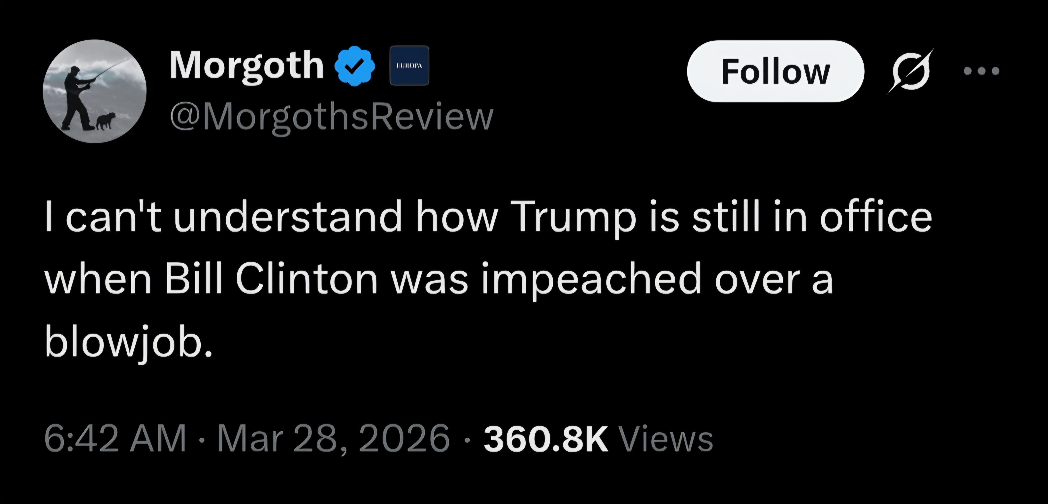 4. He was impeached for *lying* about a blowjob, not receiving one. And even then, Ken Starr (rest is piss, you colossal piece of shit) really only gave a shit because it was humiliating to the Clintons and, by extension, the Democrats.