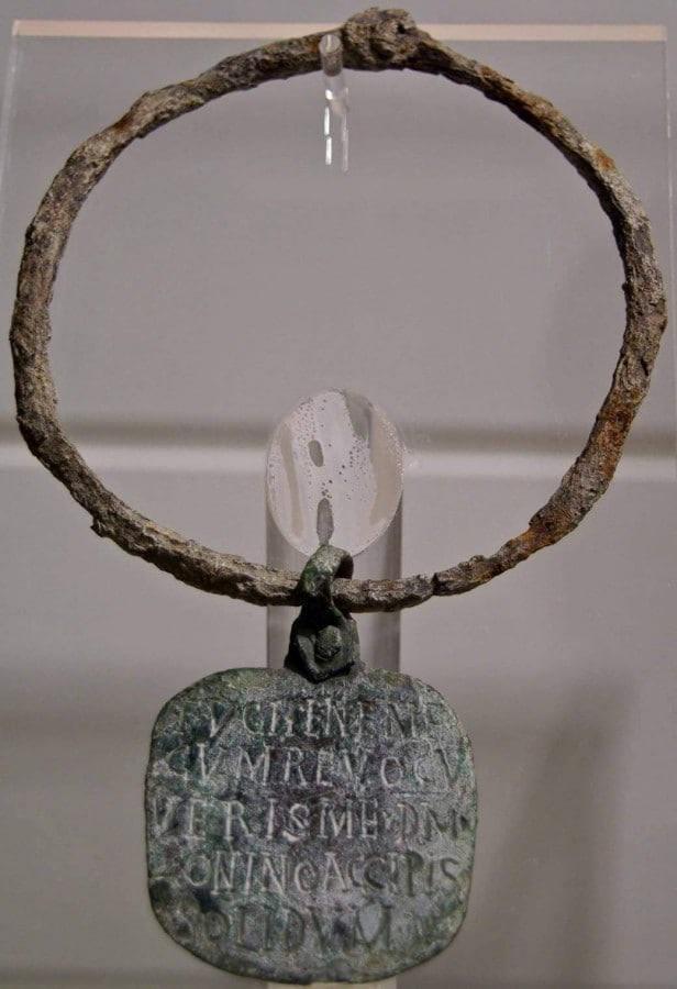 Ancient Roman slave collar with the inscription: ‘Catch me! I have run away! If you catch me and return me to my master Zoninus, you will receive a solidus (a Roman gold coin)!’, 4th century AD. (616×900)
