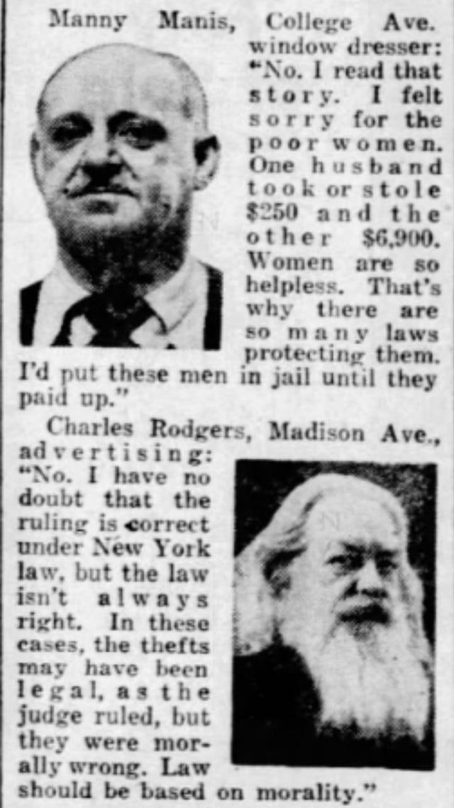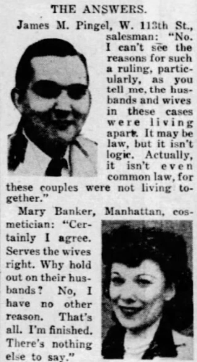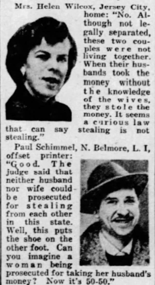Inquiring Photographer:”Judge Samuel Leibowitz has ruled that it isn’t stealing when a husband takes his wife’s money against her will. Do you agree?”January 30, 1954