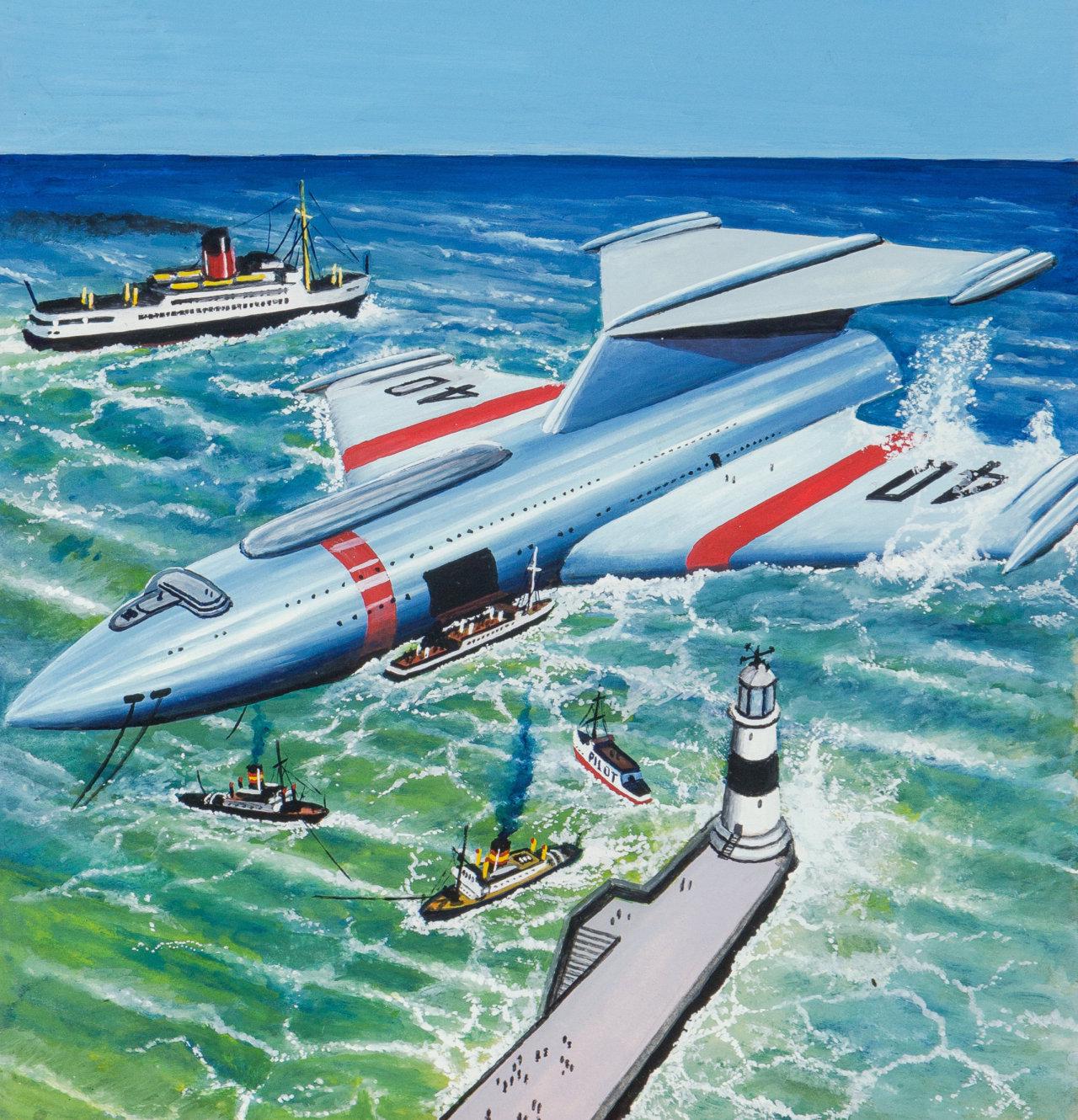 Classic mid-century retrofuturism . Art – Shigeru Komatsuzaki . This was cover art for the November 1955 issue (No. 41) of British magazine New Worlds Science Fiction
