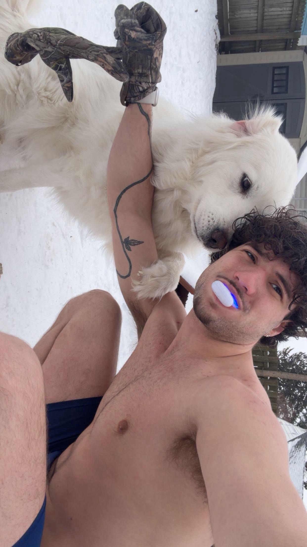 (Just a little picture of my morning routine lately, cold exposure, sunlight, playing outside with my dog… first thing when I wake up every morning !!)