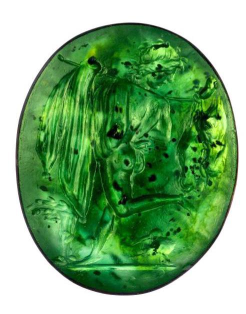 A 1st century CE Roman intaglio gem depicting a satyr hunting game birds. Made of Chrome chalcedony, now housed at the Michael C. Carlos Museum in Atlanta [492×628]