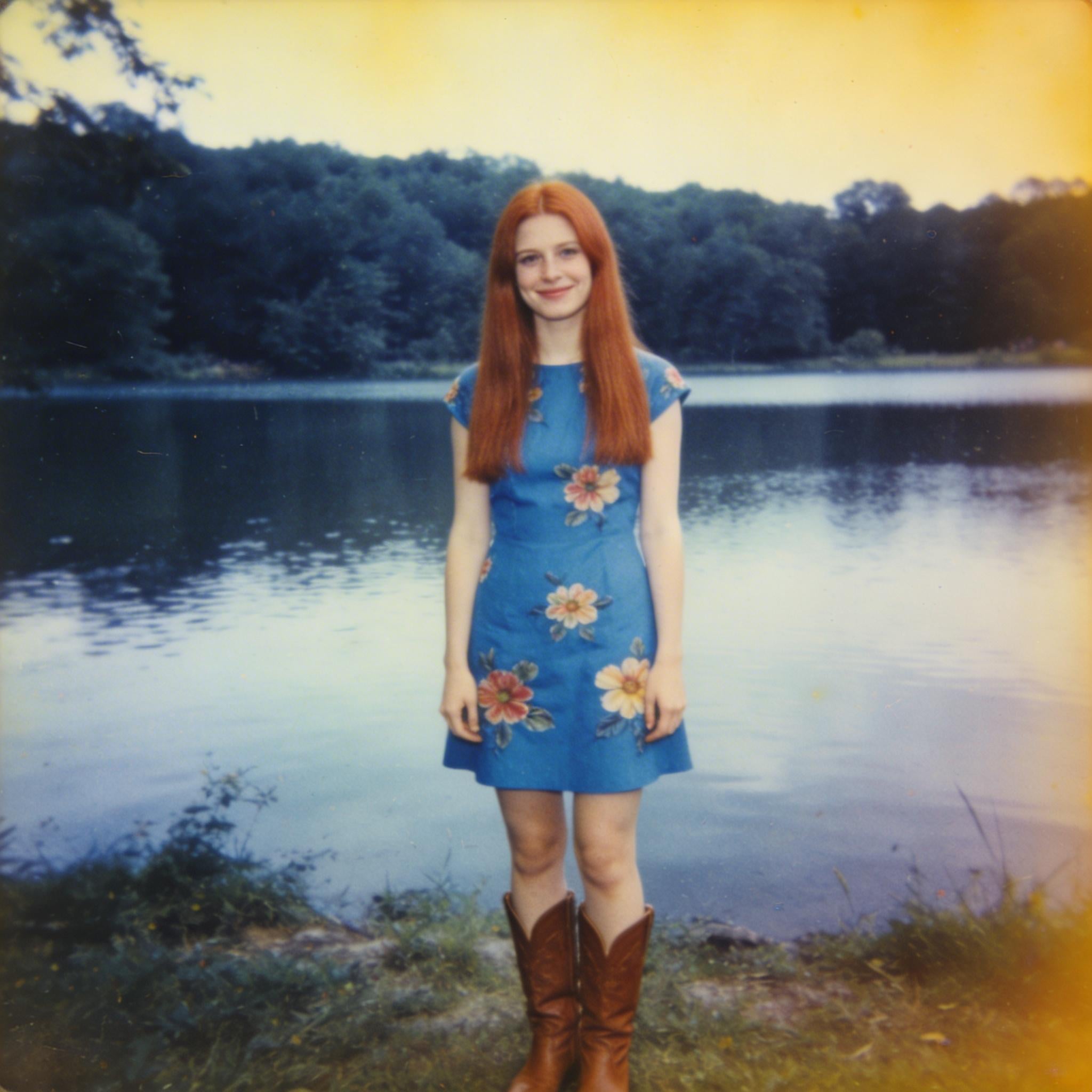 I love this pic! The colors, the dress and boots, and her beautiful hair. Time capsule.