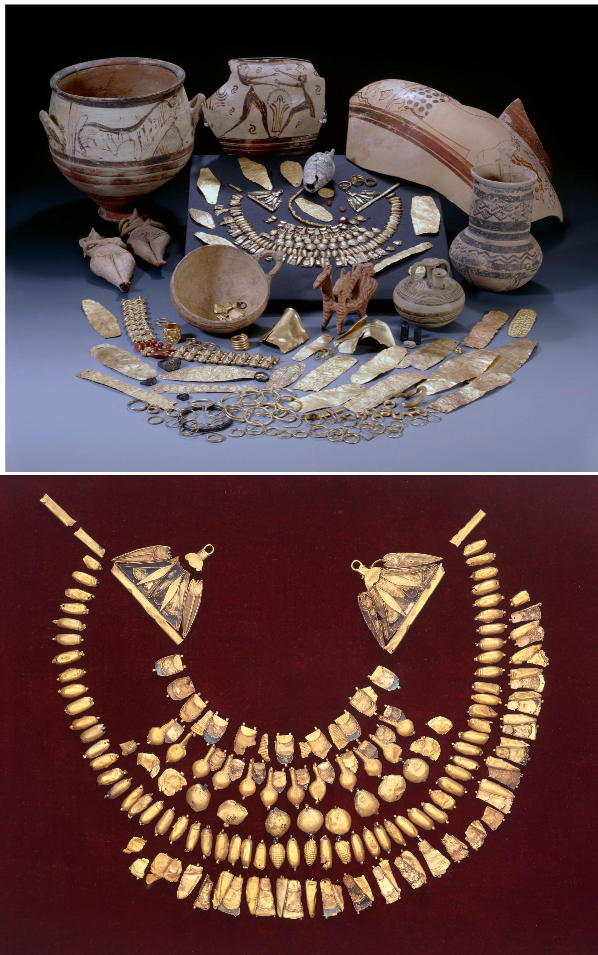 The burial assemblage of Enkomi Tomb 93, from Cyprus and now housed at British Museum. The tomb contained the wealthiest grave goods from the archaeological site of Enkomi, totaling approximately 1,430 grams of gold, including a gold pectoral made in Egypt in 1400-1100 BCE [2500×3992]