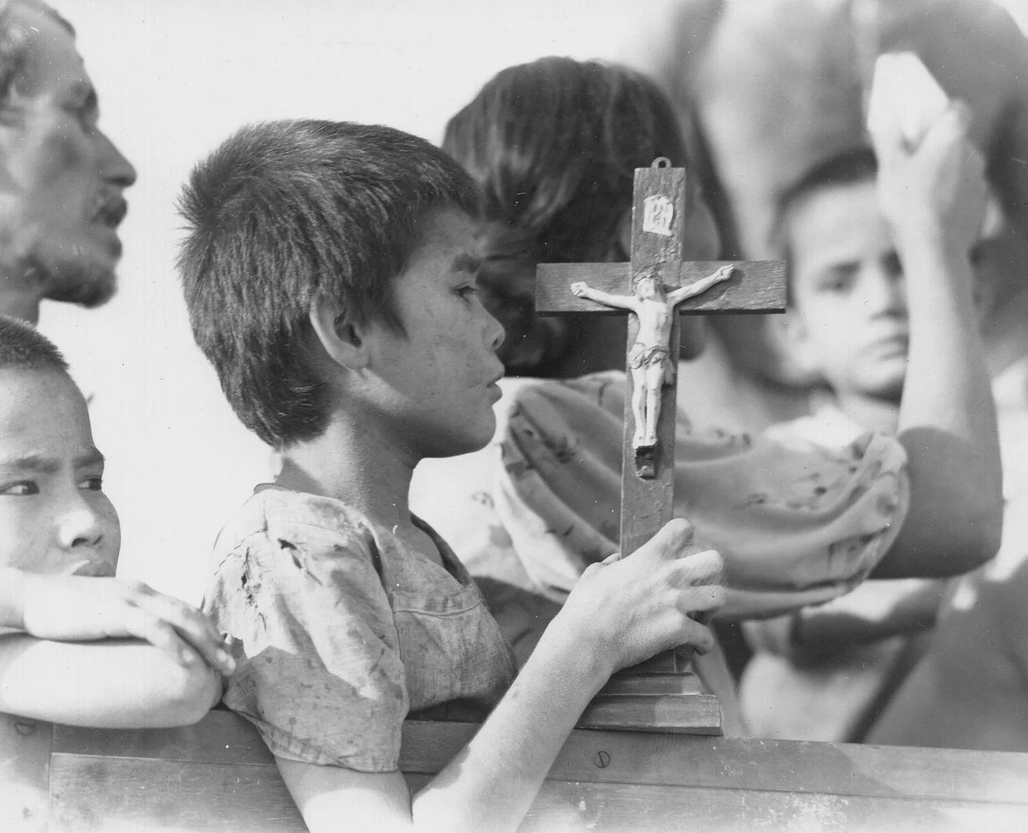 A young Chamorro boy clutches his crucifix as he rides to a civilian interment camp during the battle of Saipan, July 1944. USMC photograph [1500×1215]