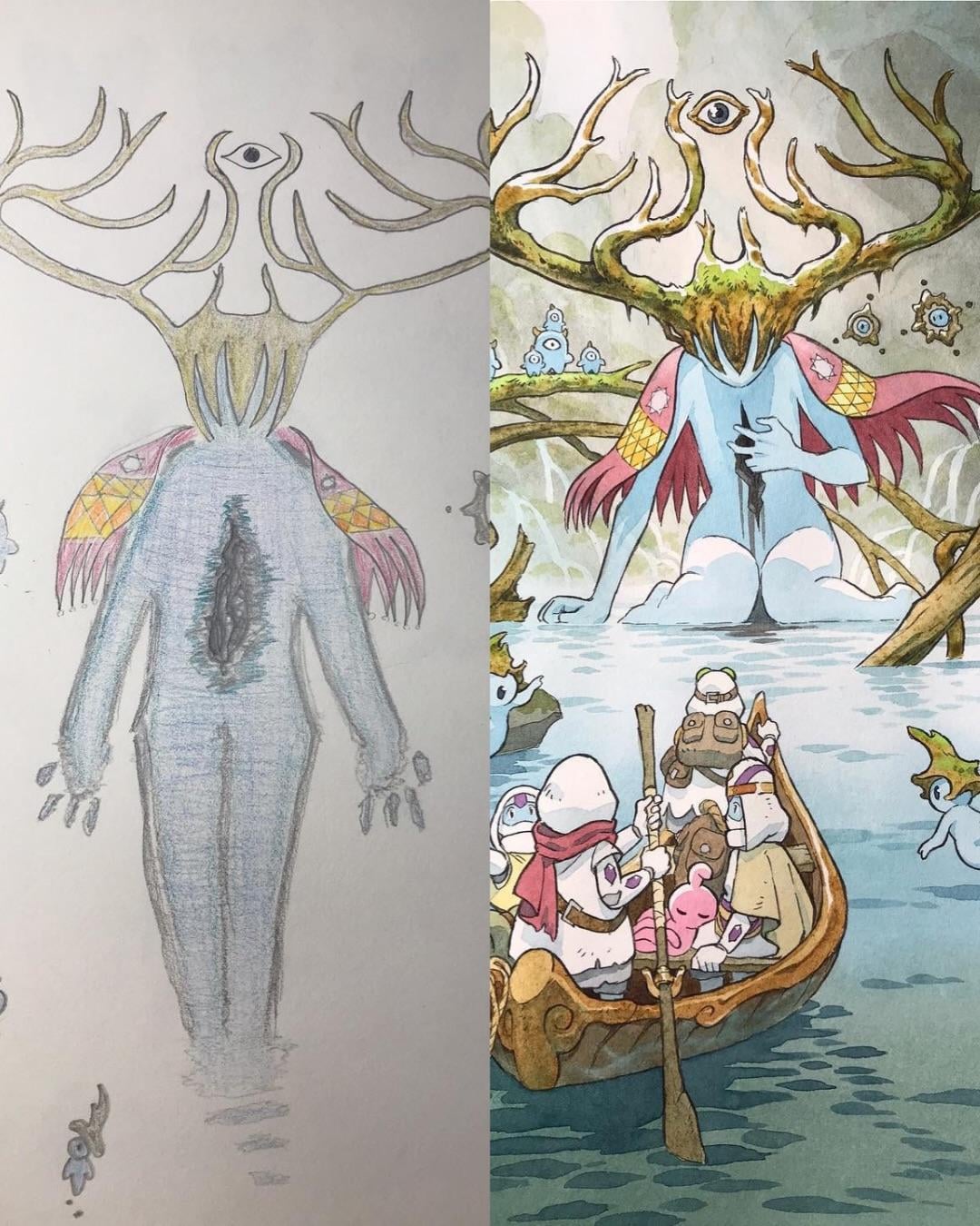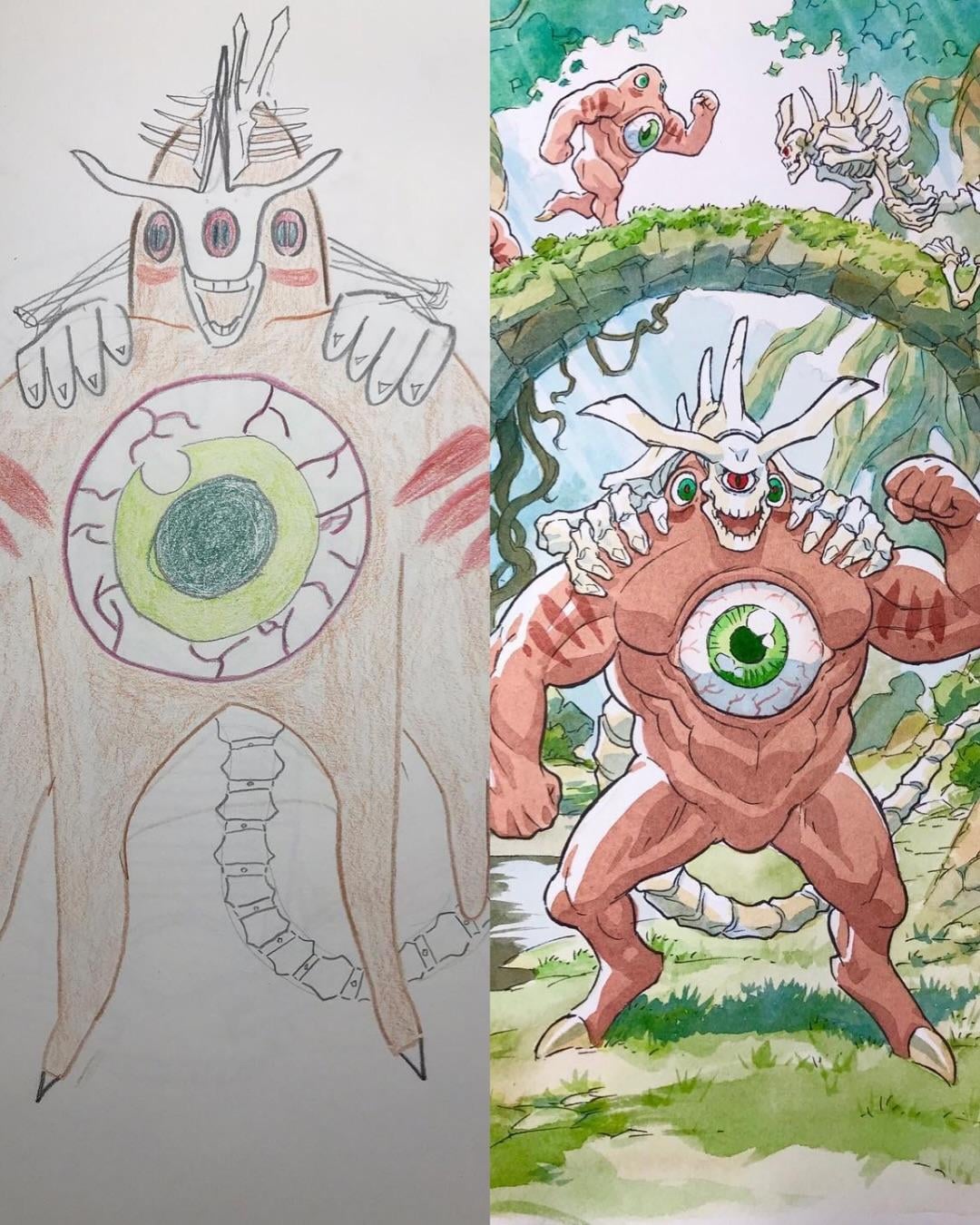 In particular, the more monstruous ones like the grey hulk with white horns and multiple eyes, or the one with the massive eyeball in the enter of it’s chest, and the blue one with antlers and a floating eye. There is a horror to the son’s drawing that’s missing from Thomas Romain’s interpretation.