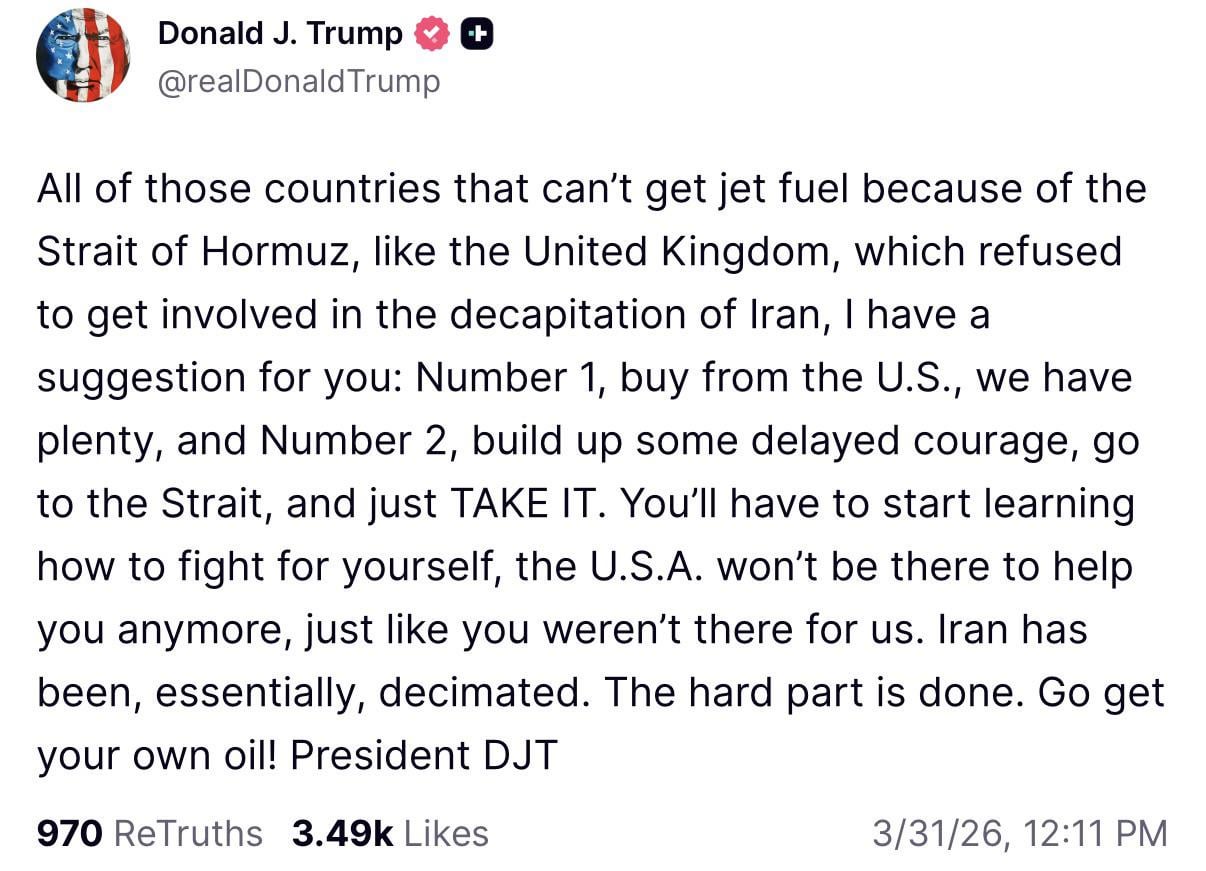 “Go secure the straight of Hormuz for us because we started a war we can’t win and need someone else to clean up our mess at their expenses.” – The US of A.