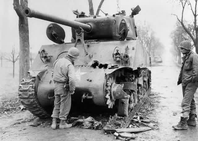 GIs examine multiple frontal penetrating hits on a 14th Armored Division M4A3(76)W Sherman tank knocked out near Barr in Alsace in late 1944 [640×455] by UrbanAchievers6371