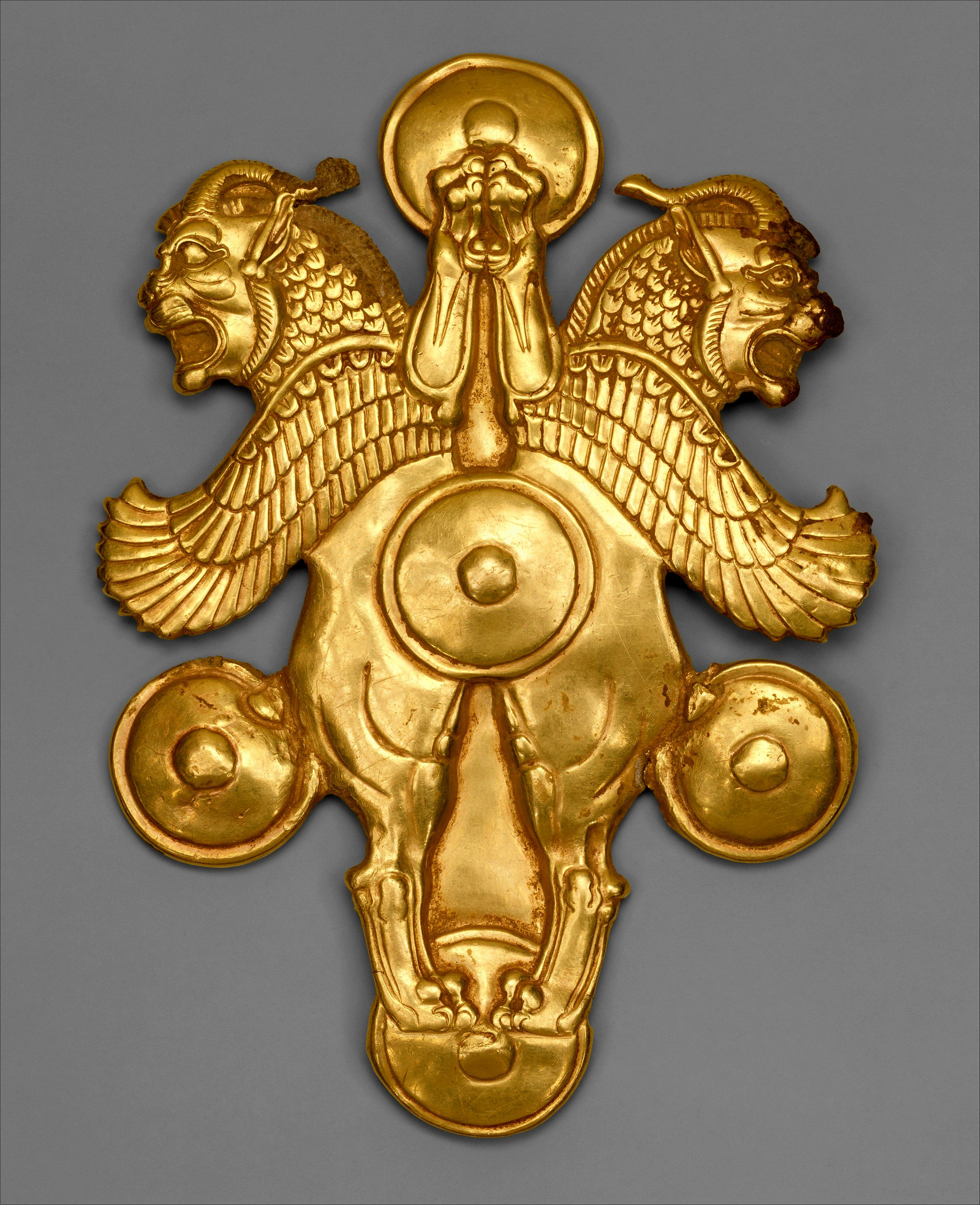 This ornament depicts a winged lion-monster. In place of the lion's ears they have those of a bull. Horns curl back over spiky manes and the lion's neck is covered with a feather pattern. Sharply stylized wings extend over two of the five bosses and serve as decorative balace for the design. Heavy rings attached to the back suggest that the ornament was worn on a leather belt. the similar treatment of the lion motif on different types of objects demonstrates decorative conventions of the period.