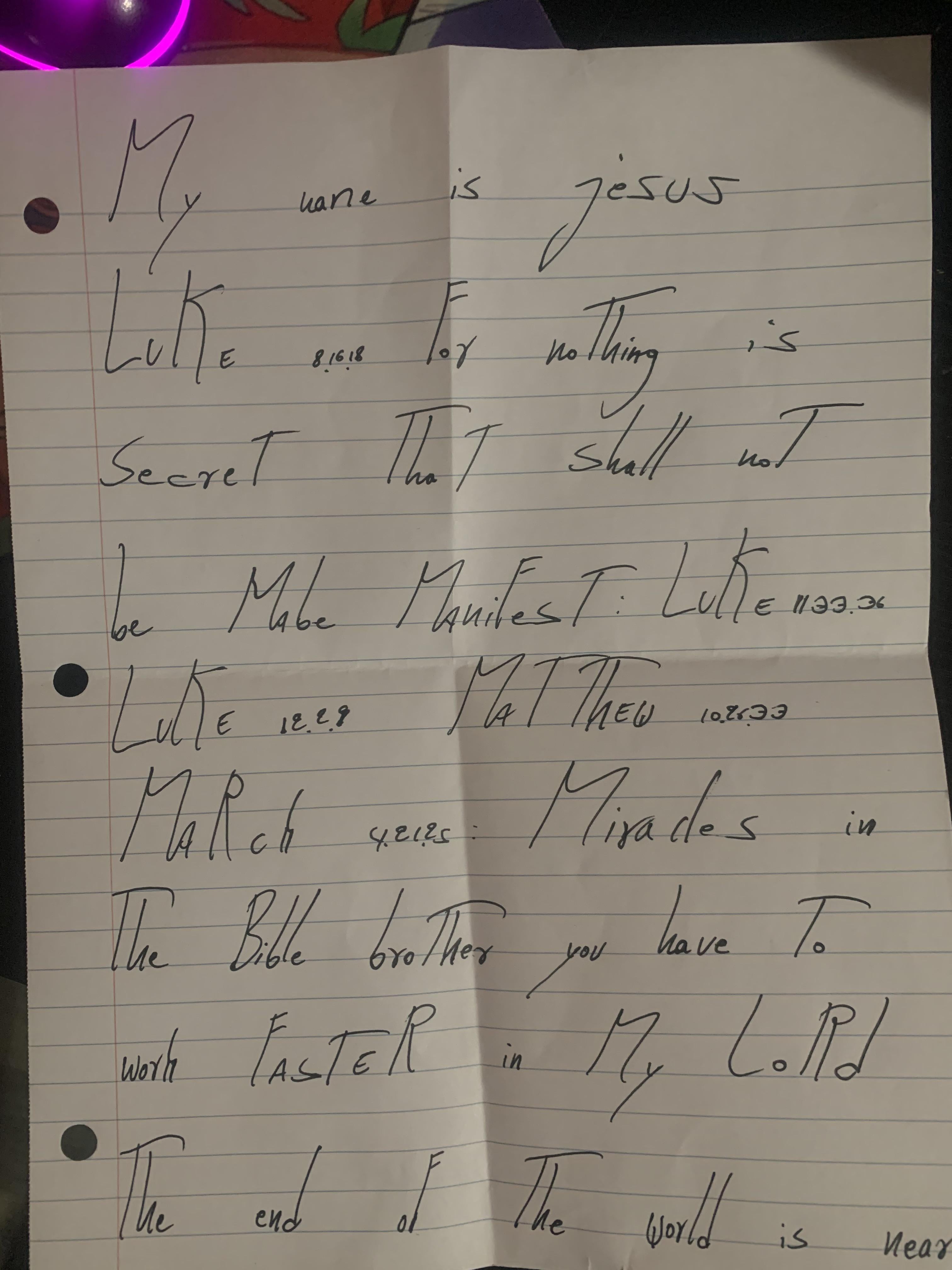 The handwriting hurts my eyes, also I feel like this is some religious schizophrenia stuff.