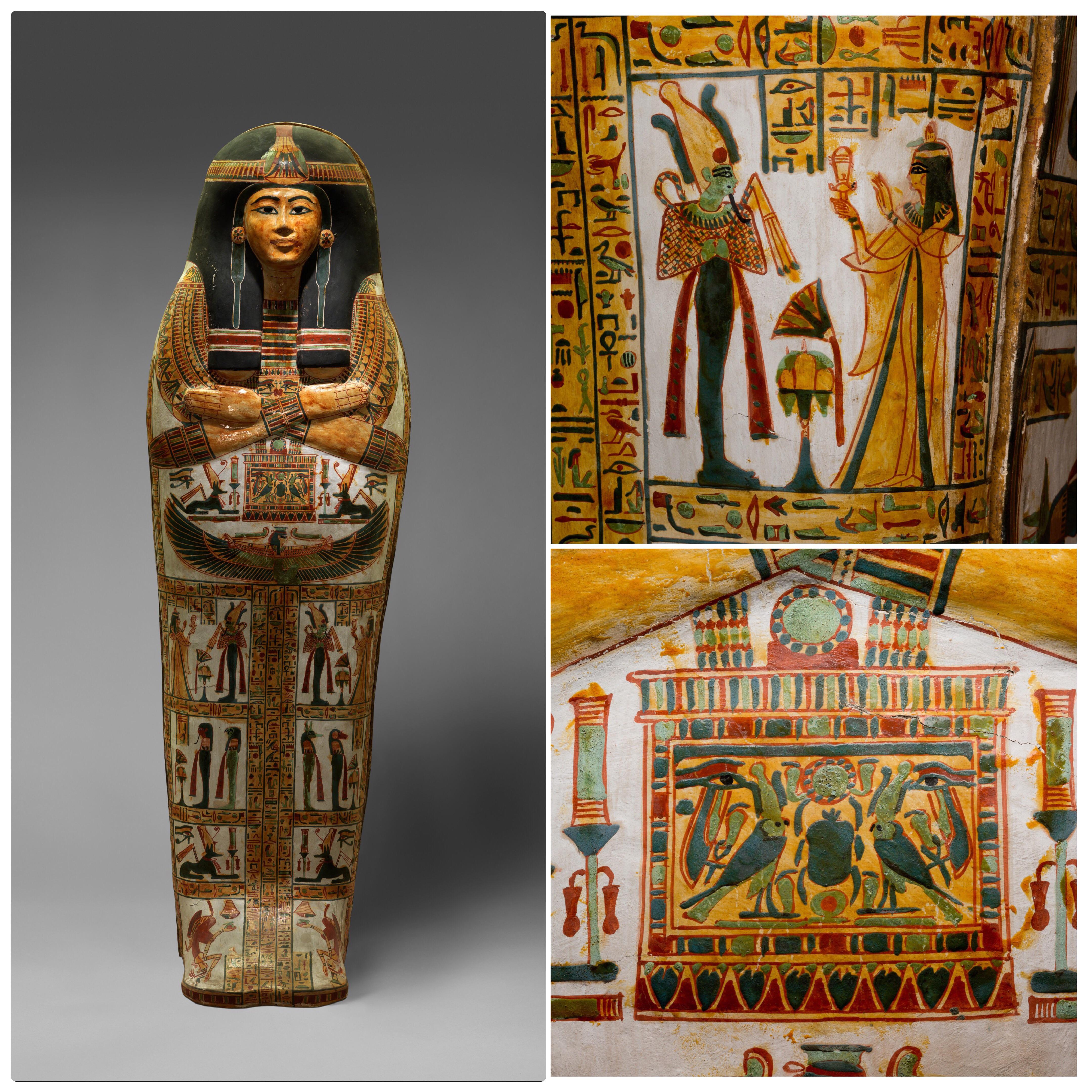 The outer coffin lid, intended to resemble a wrapped mummy, wears an elaborate pectoral in the shape of a small shrine within which are two winged wedjat eyes, with suspended uraeus cobras holding ankhs. Below these, Horus falcons flank a central scarab that pushes a sun disk upward, an image of the rising sun and of rebirth. The composition is similar to the Middle Kingdom pectoral of SitHathoryunet. At the sides of this pectoral are figures of Anubis, god of mummification, represented as a jackal wearing the crowns of Upper and Lower Egypt and holding empowering scepters.