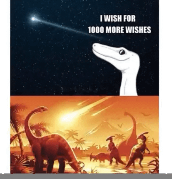 I love this meme format NGL. Even tho it was more of a “one big, earth shattering wish” so I wish someone would do that. But I have not seen this version of the meme! So tyvm, another one for the collection >:3