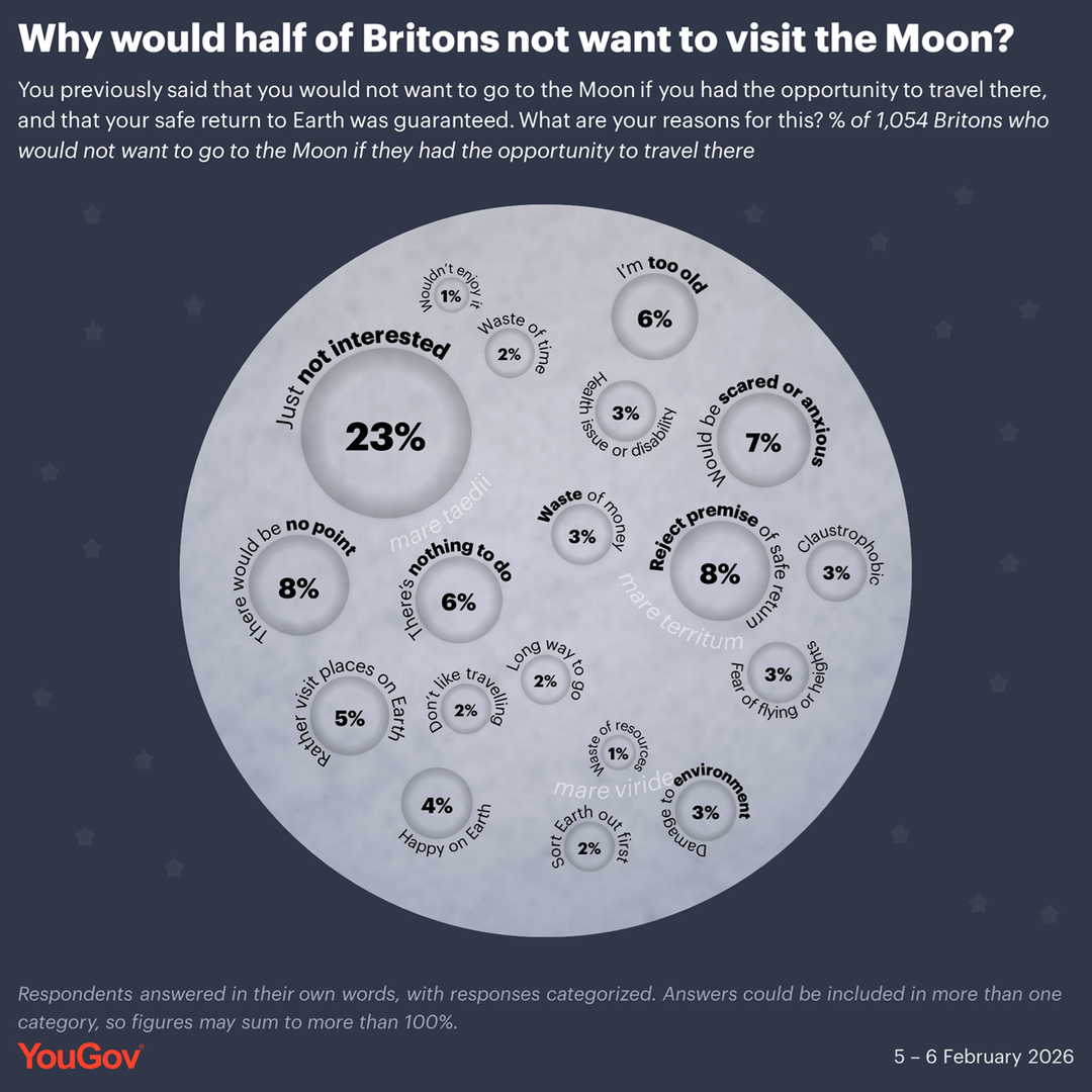 As Artemis II prepares to blast off for a trip around the Moon, taking humans outside of lower Earth orbit for the first time since 1972, we decided to look at whether the British public would want to go the Moon themselves, if they were given a chance where their safe return to Earth could be guaranteed.