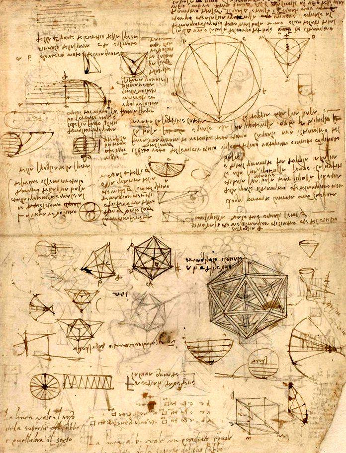 Notes of Math and Physics from the Codex Atlanticus, a 12-volume, bound set of drawings and writings (in Italian) by Leonardo da Vinci (1452–1519) [1200×900]