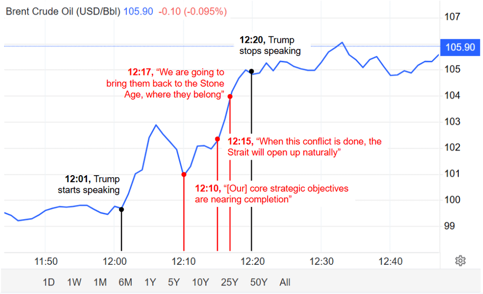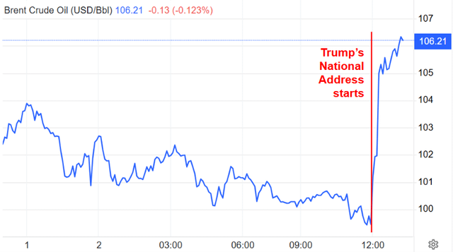 Trump started his address at 12.01pm. Oil prices rose in real time as he spoke.