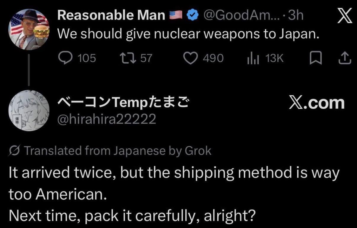 Reminder that Japan is considered “nuke ready” in the sense that they have the knowledge and infrastructure and could get a nuke if they wanted
