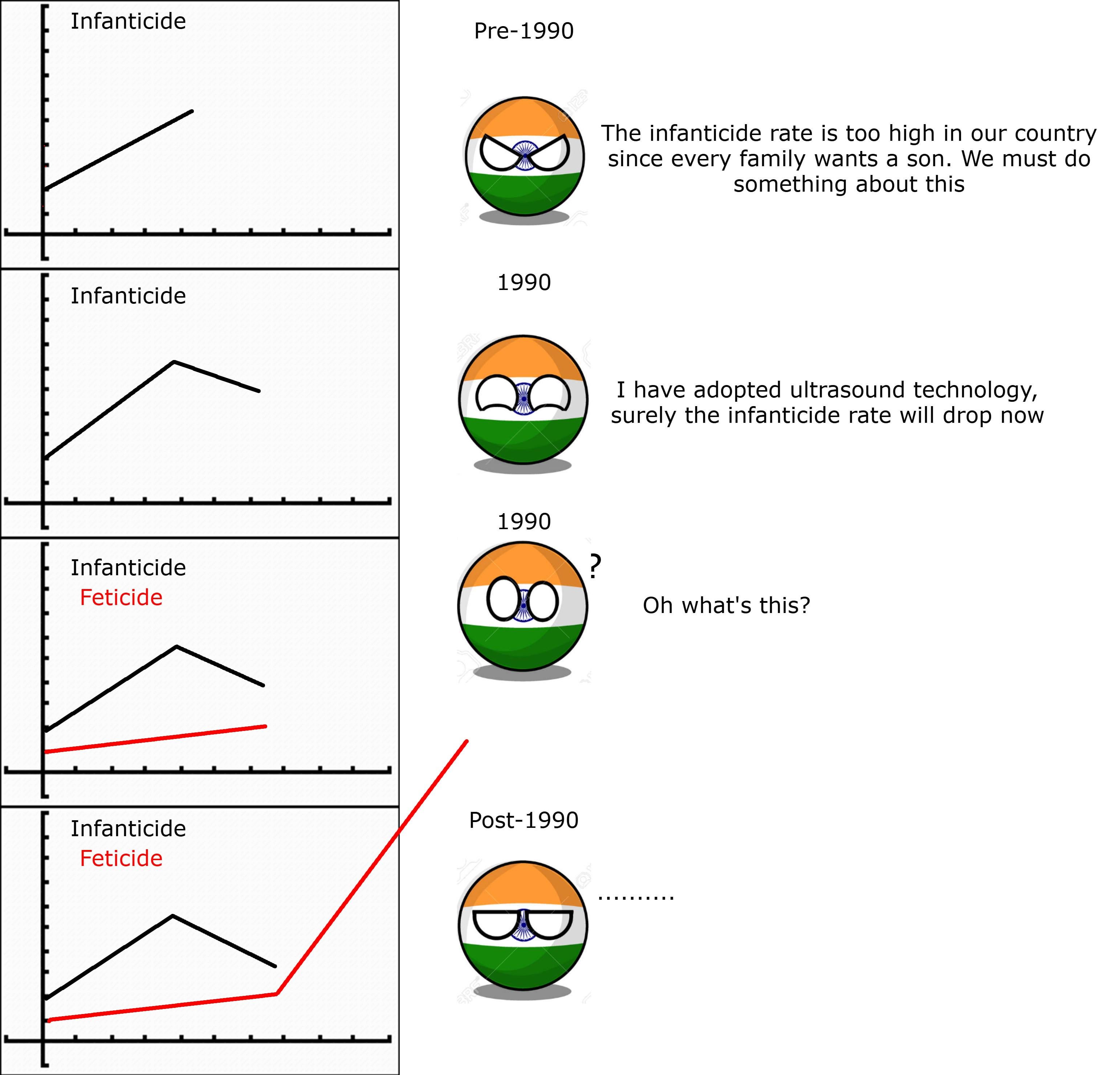 This prompted the Indian government to ban the usage of ultrasound technologies for the purpose of finding out the sex of the fetus in 1996 because their demographic shifted massively with there being more men then women