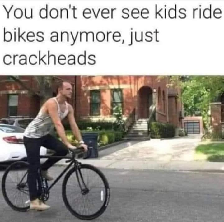 We have these illegal E-bikes and it’s teens and crackheads on those and bikes it’s usually middle aged dads in Lycra Cycling kit.