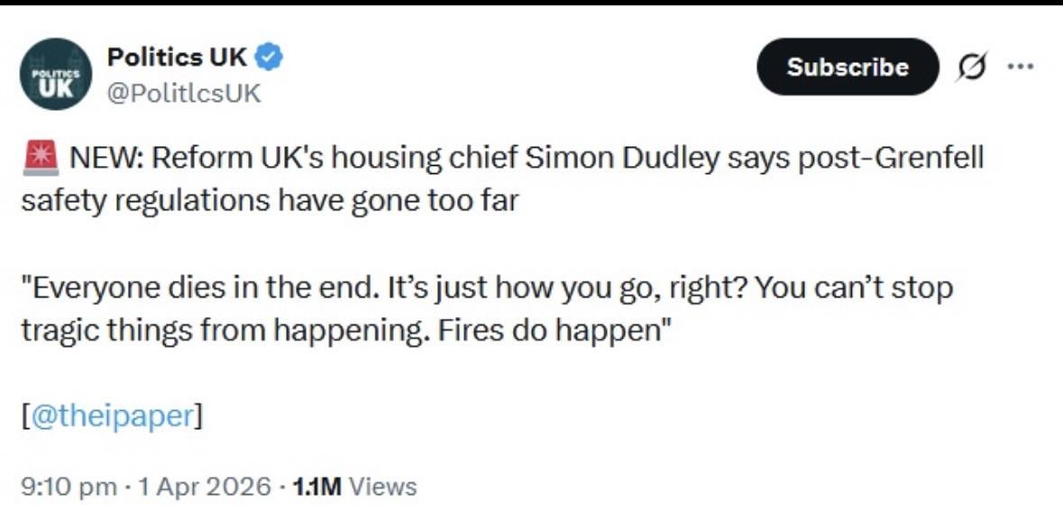 Another day, another Reform sacking. We should start playing bingo. What’ll it be today, photo of candidate doing a Nazi salute, revelations of dodgy financial dealings, suspect links with Russian oligarchs, or an absolute dearth of empathy for the (numerous!) victims of an entirely preventable fire for which nobody has yet been held accountable?