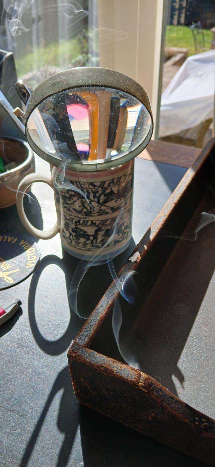 Walked in to my Dad’s study and prevented accidental fire from Magnifying glass burning stationary