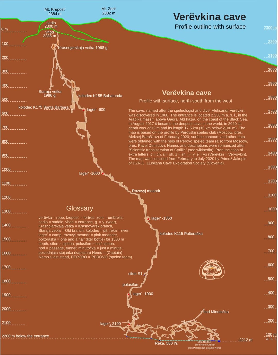 “During an expedition in 2021, PST found the body of a caver, who died exploring on his own, at −1,100 meters (−3,600 ft). He was later identified as Sergei Kozeev, who left his home in Sochi (Russia) on 1 November 2020 and began descent into Veryovkina, where he spent around a week at a −600 meters (−2,000 ft) permanent camp. Then he continued his descent down to technically challenging parts at −1,100 meters (−3,600 ft) where he got stuck, and died of hypothermia. He did not bring stirrups necessary to climb out of the lower, perpetually wet, regions of the cave. [17] The body was eventually recovered after a complex retrieval operation on 17 August 2021.[18]”