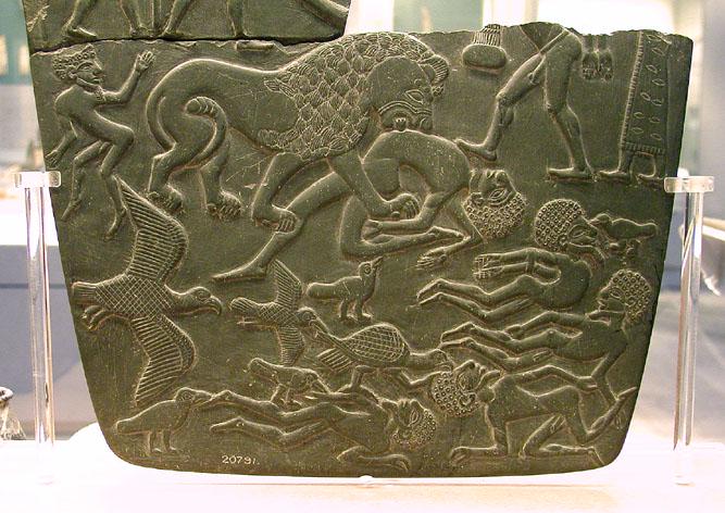 The Battlefield Palette of late prehistoric Egypt shows slain enemies of the king (possibly a proto-pharaoh) being devoured by lions and vultures. [667 x 472]